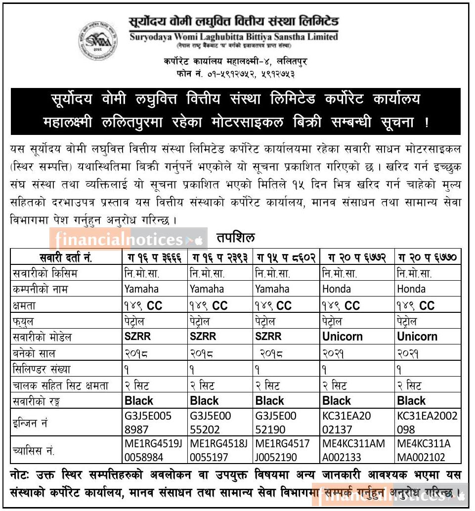 मोटरसाईकल बिक्री सम्बन्धी सूचना