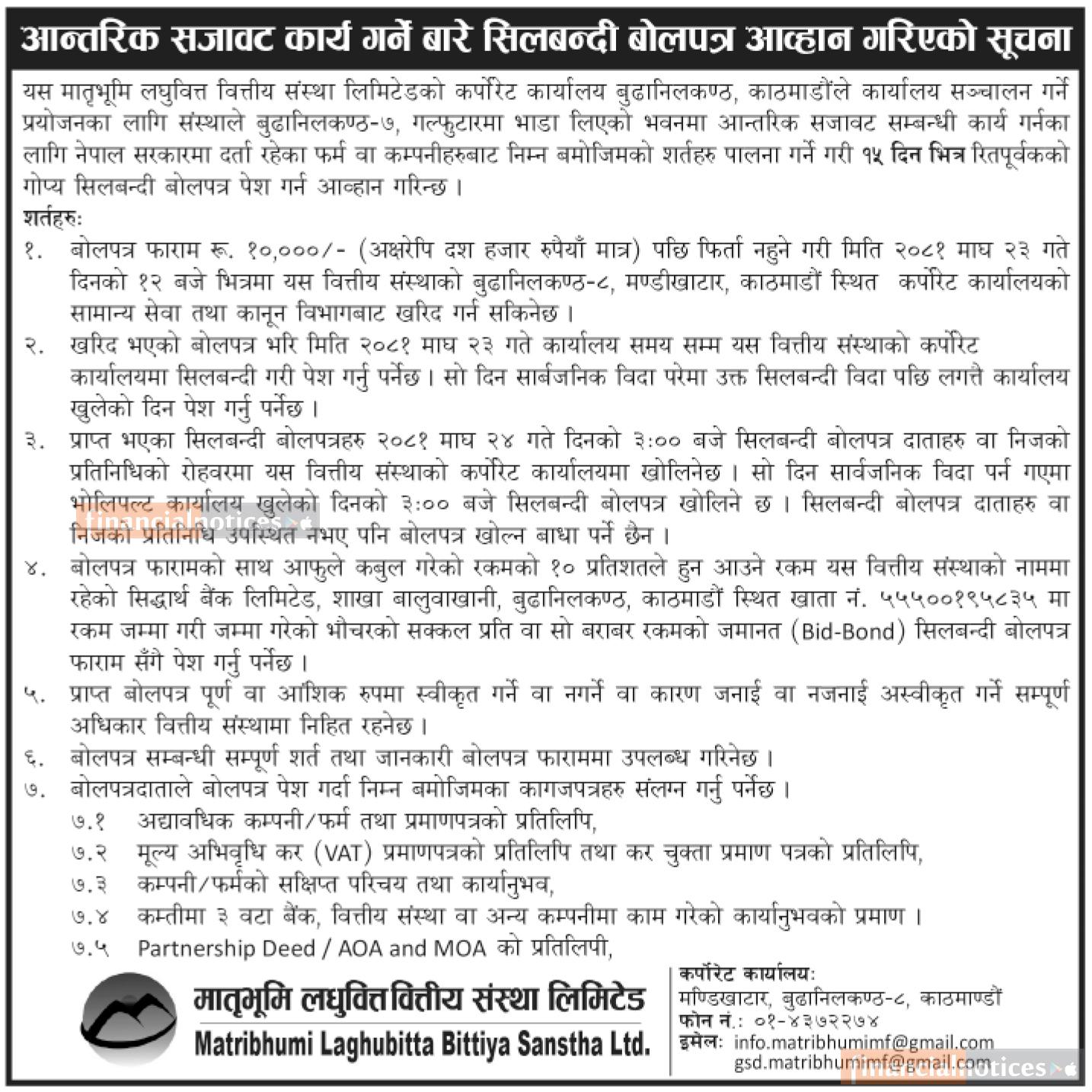 आन्तरिक सजावट कार्य गर्ने बारे शिलबन्दी बोलपत्र आव्हानको सूचना