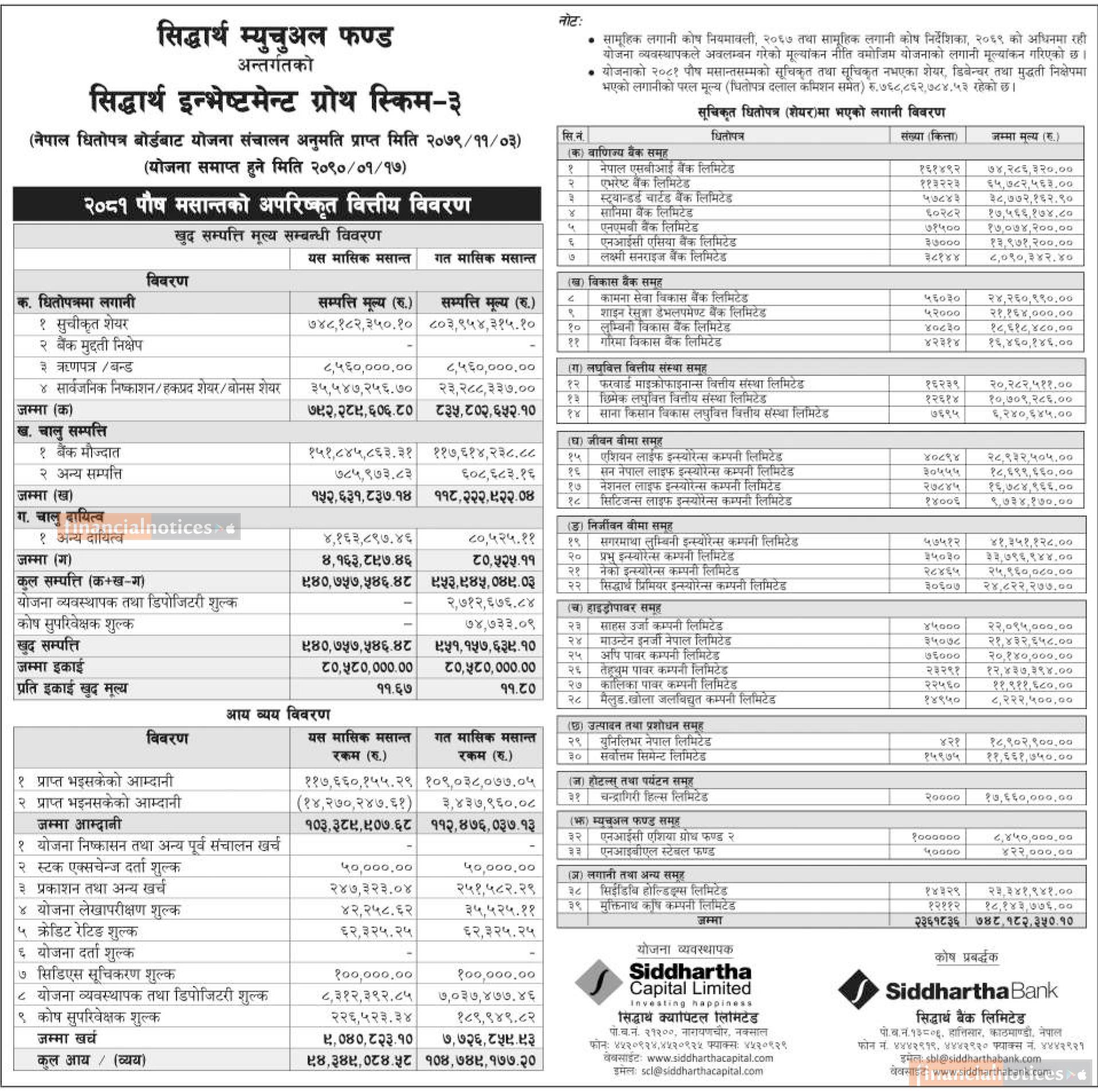 Siddhartha Capital has published “Siddhartha Investment Growth Scheme - 3” NAV till Poush, 2081