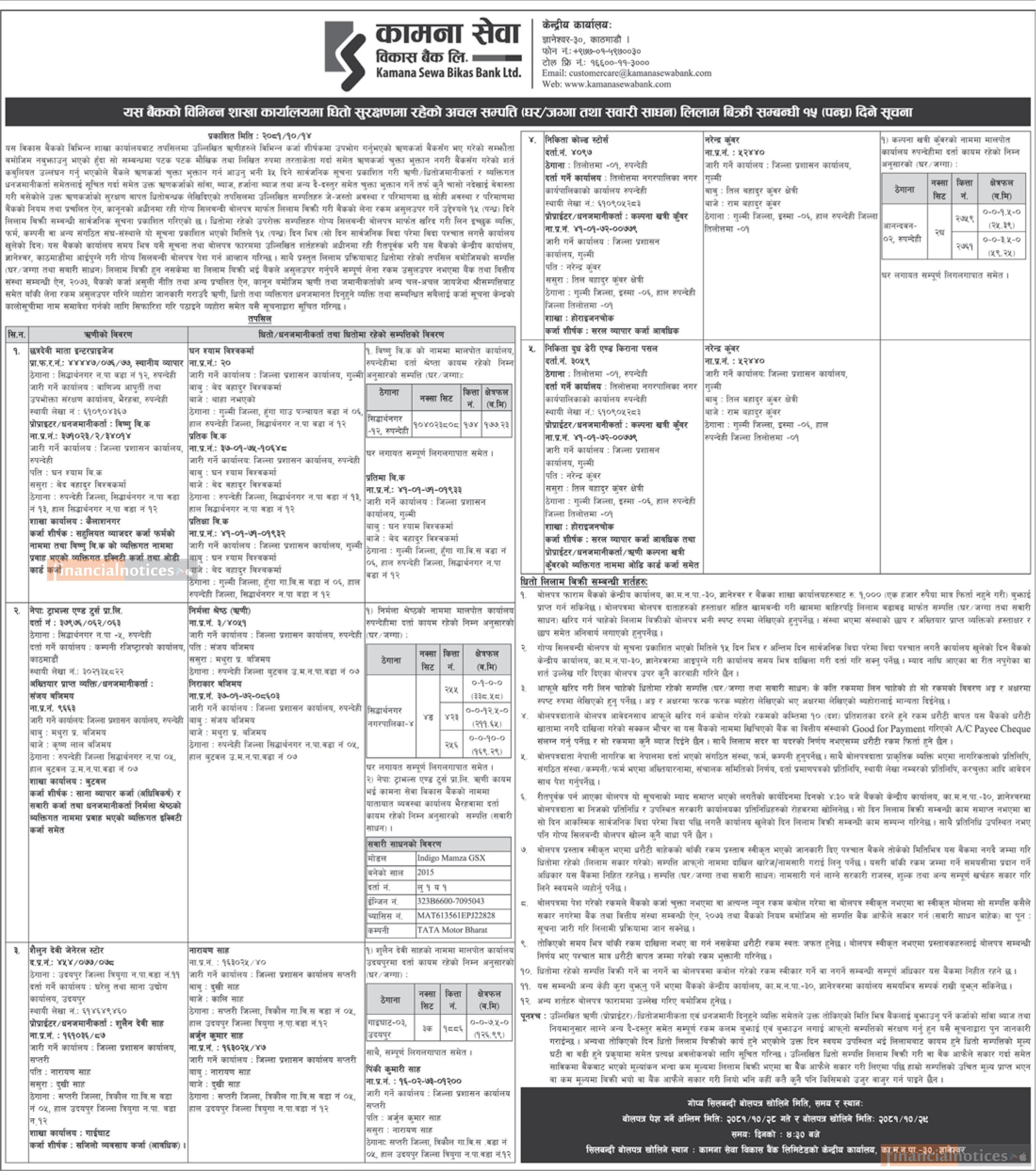 कामना सेवा विकास बैंकको घर जग्गा लिलाम बिक्री सम्बन्धी ३५ दिने सूचना -