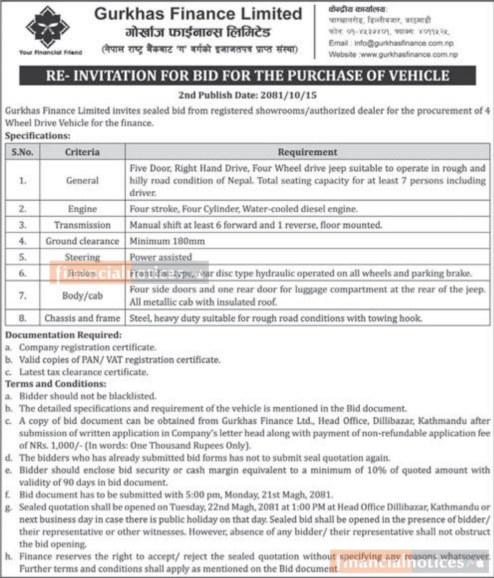 Re-Invitation for bids for the purchase of Vehicle