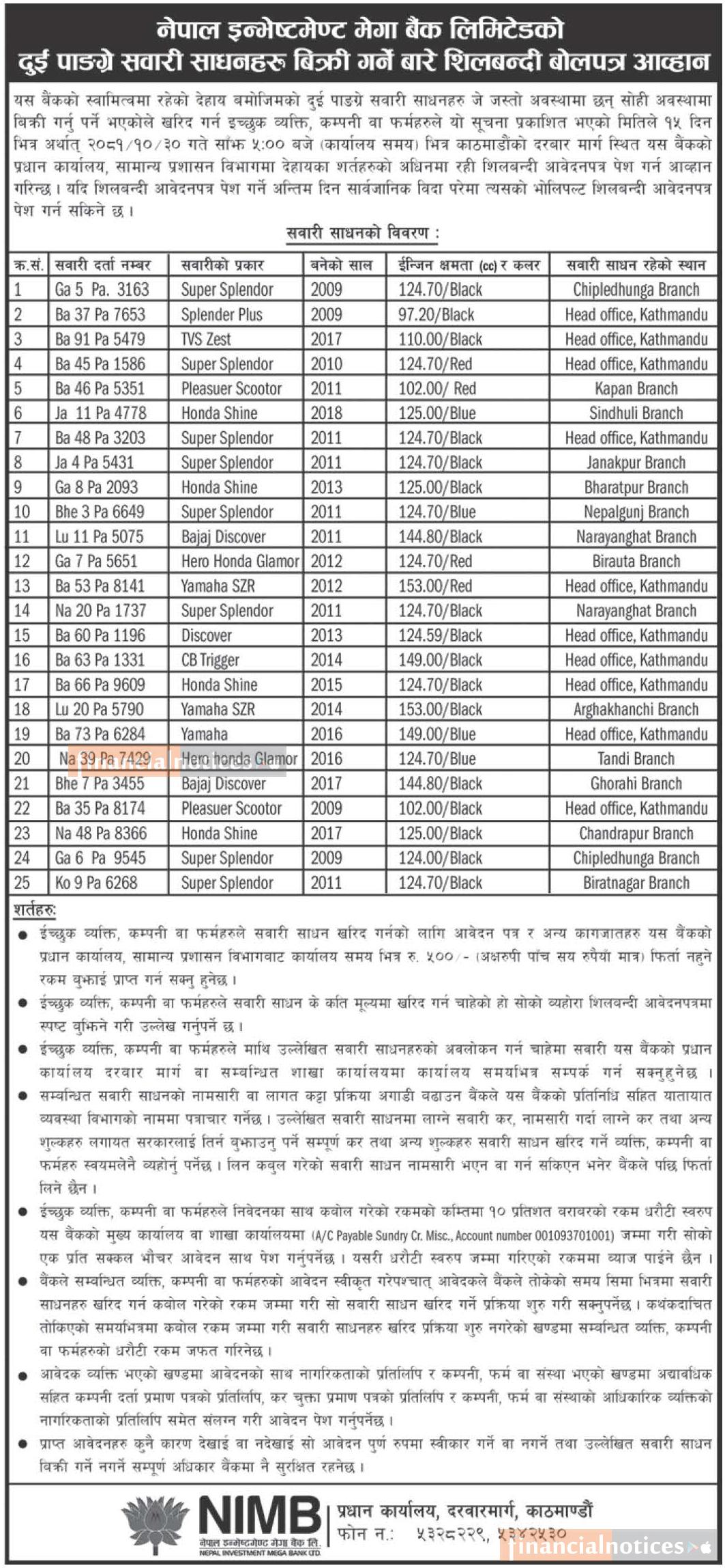 दुइ पांग्रे सवारी साधनहरु बिक्री गर्ने बारेको शिलबन्दी बोलपत्र आव्हानको सूचना