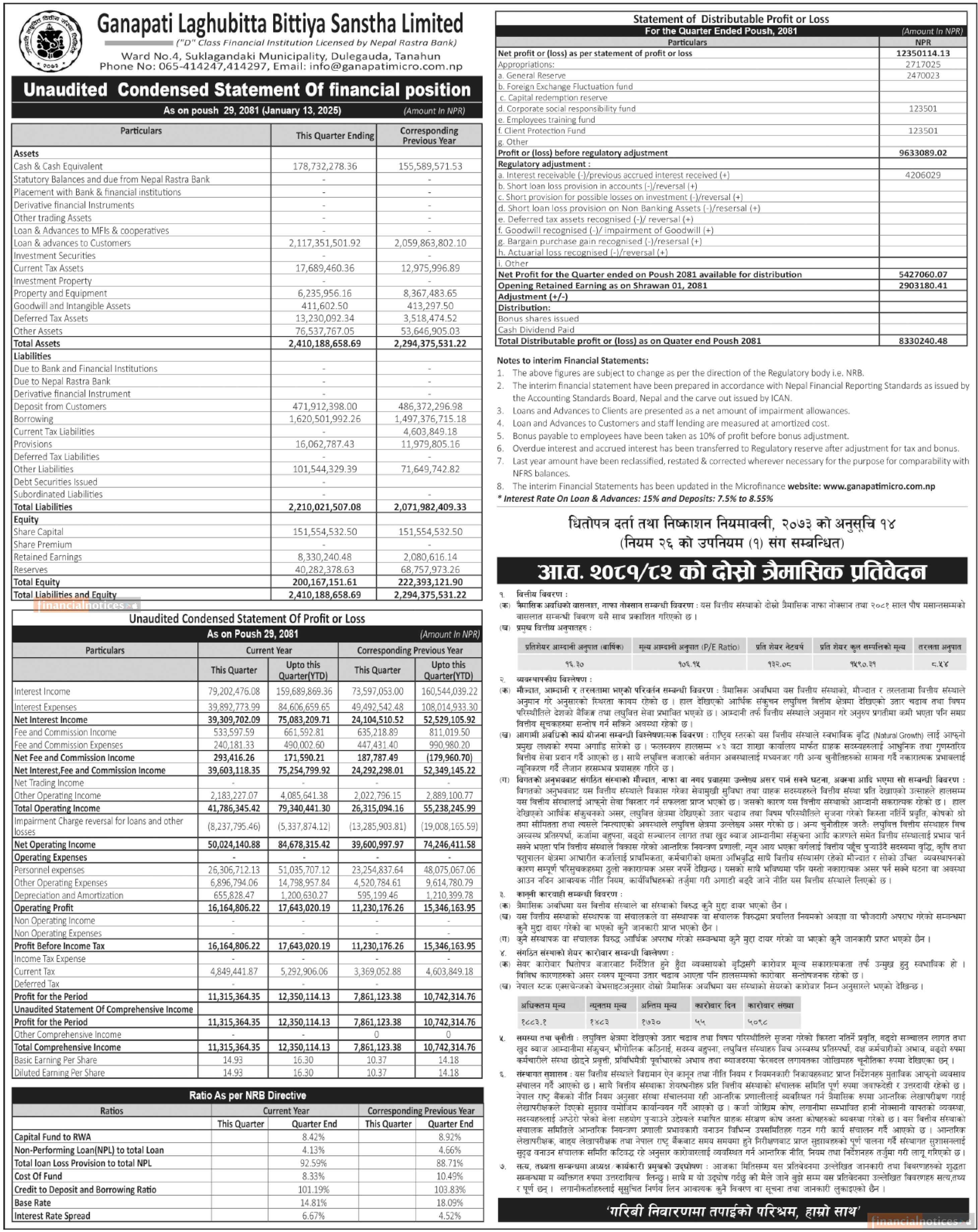 गणपति लघुवित्तको खुद नाफा १४.९७ प्रतिशतले बढेर १ करोड २३ लाख ५० हजार रुपैयाँ - Q2 Report -