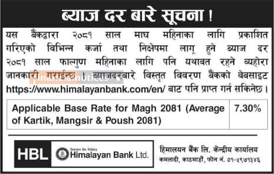 ब्याजदर बारे हिमालयन बैंकको अत्यन्त जरुरी सूचना