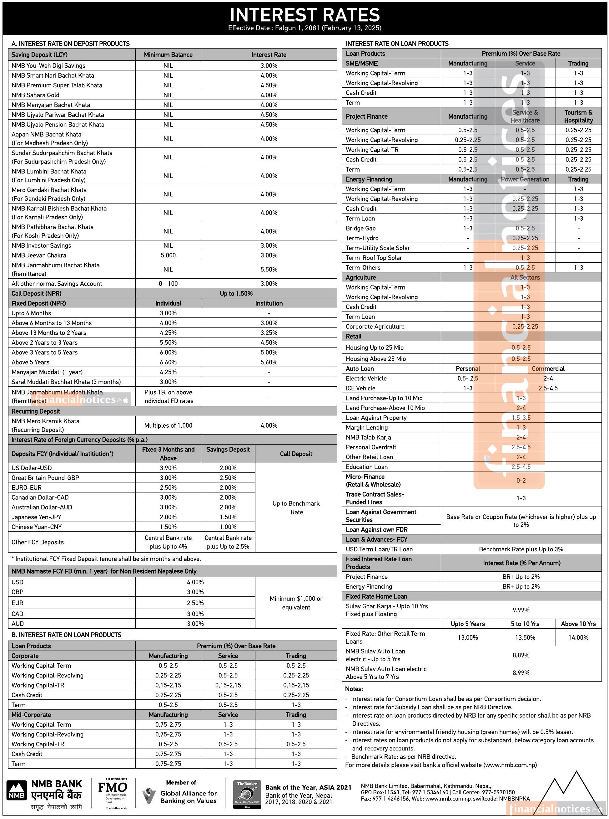 एनएमबि बैंकको ब्याजदर परिवर्तनः फागुन १ देखि नयाँ दर - Interest Rates -