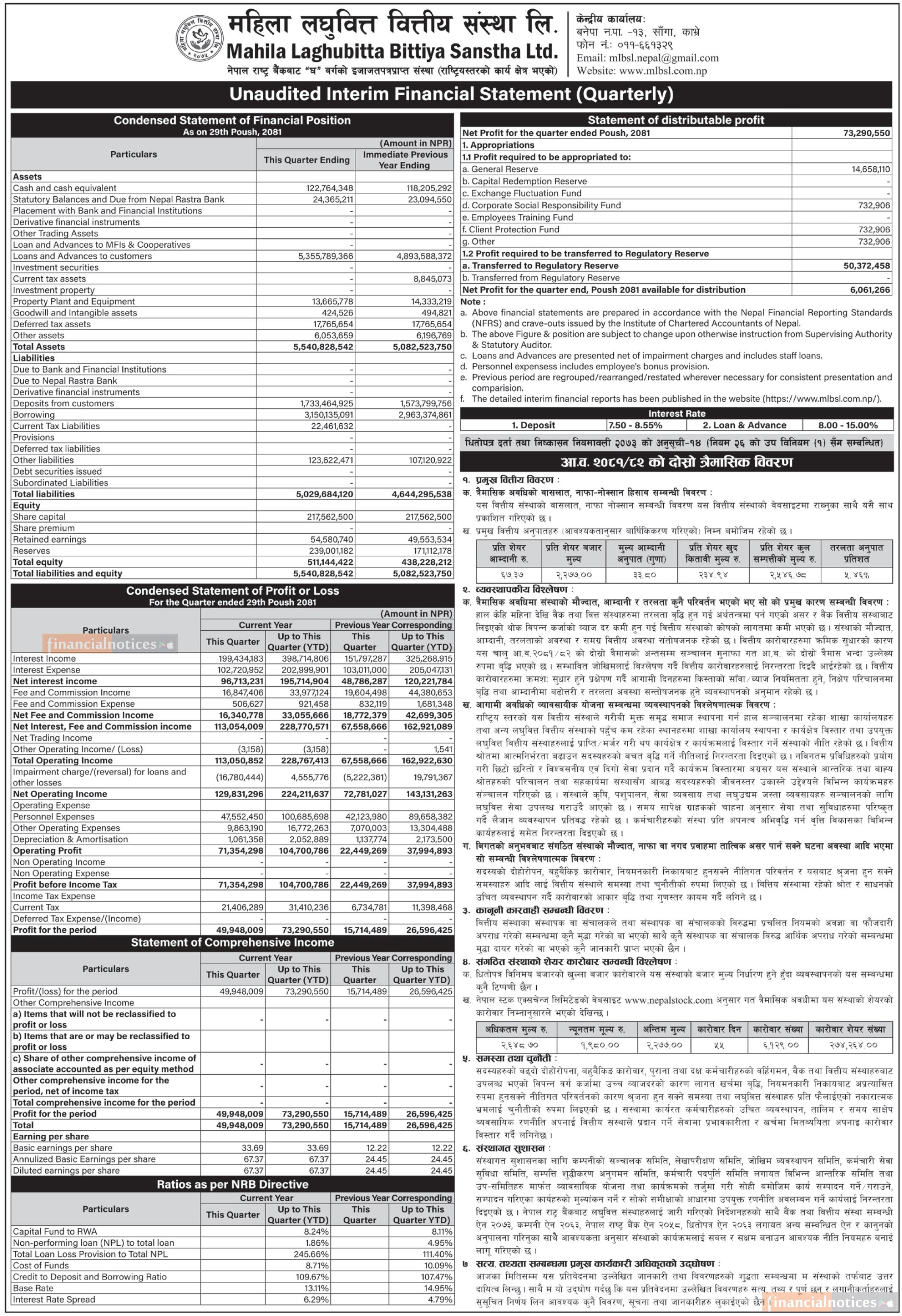 महिला लघुवित्तको खुद नाफा ७ करोड ३२ लाख रुपैयाँ -Q2 Report-