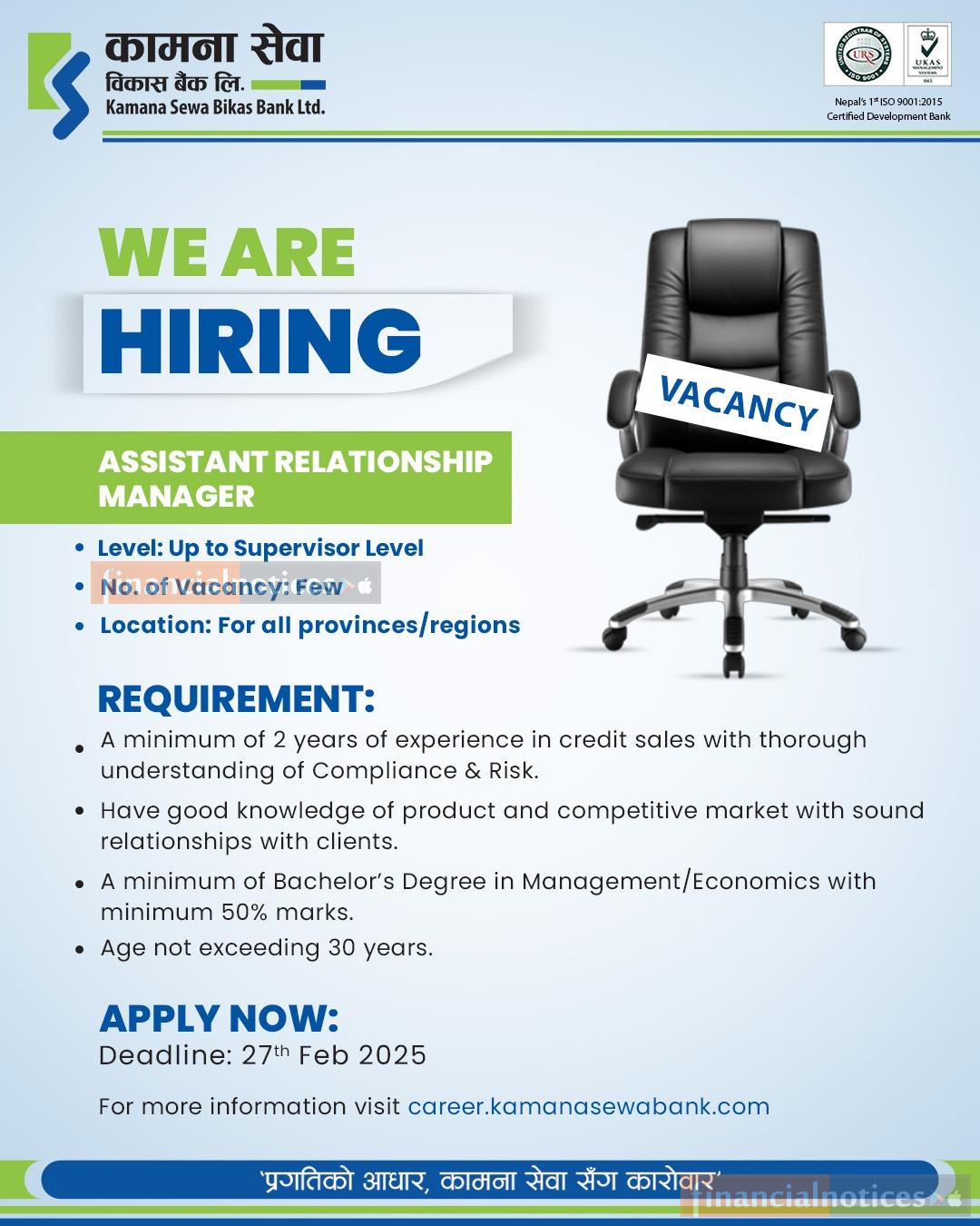 Kamana sewa Bikas Bank has opened applications for the position of Assistant Relationship Manager across all provinces and regions, offering opportunities for professionals to advance up to the supervisory level. The bank seeks qualified candidates with a strong background in credit sales and client relationship management to fill a limited number of vacancies.
