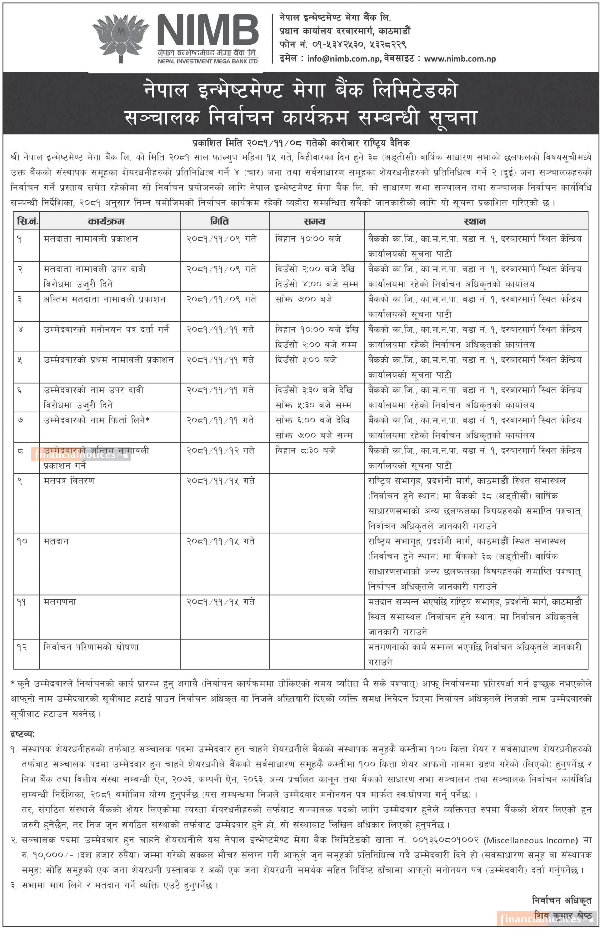 नेपाल इन्भेष्टमेण्ट मेगा बैंकको संचालक निर्वाचन कार्यक्रम सम्बन्धी सूचना