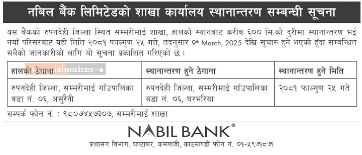 नविल बैंकको शाखा कार्यालयहरु स्थानान्तरण सम्बन्धी सूचना