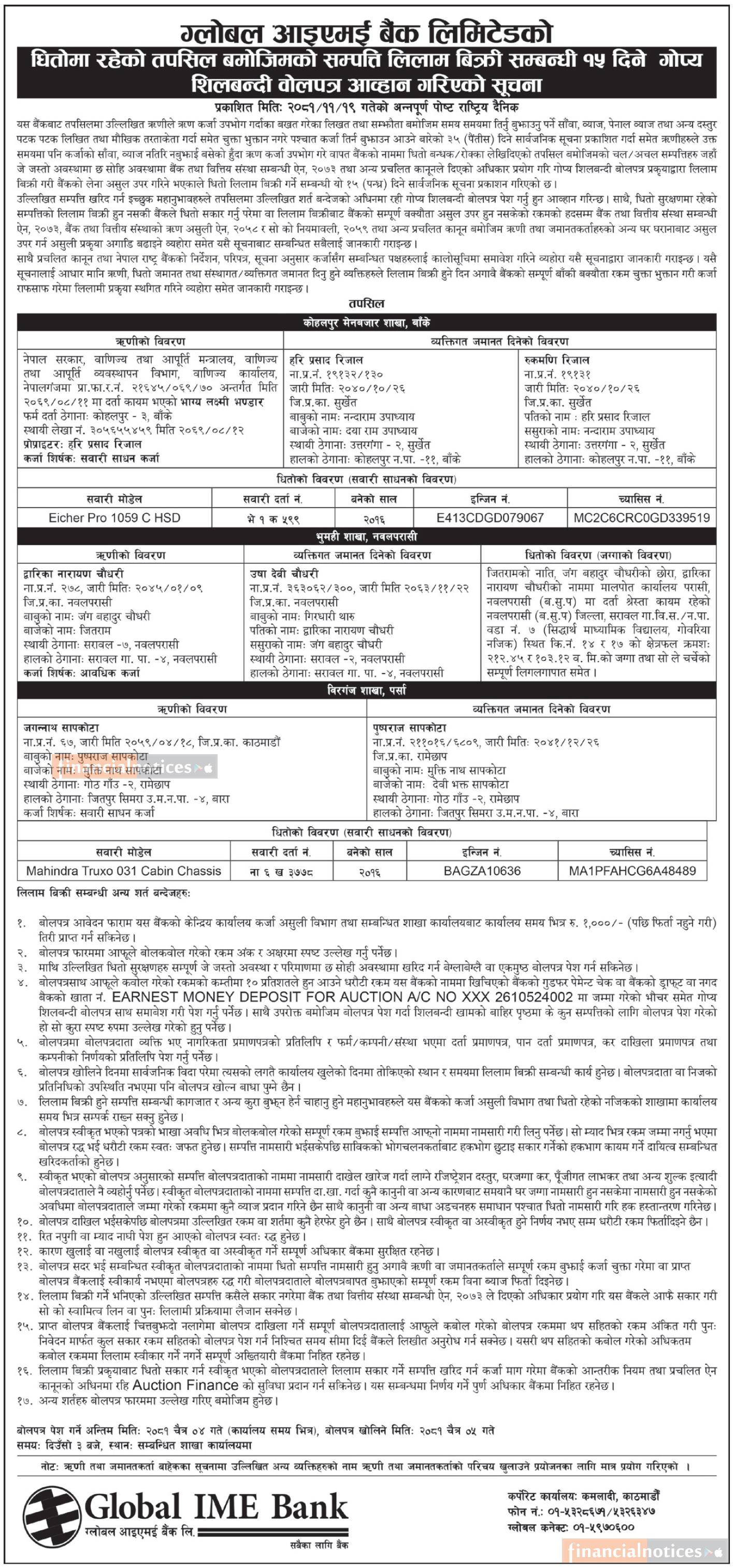 सम्पत्ति लिलाम बिक्री सम्बन्धी १५ दिने गोप्य शिलबन्दी बोलपत्र आव्हानको सूचना