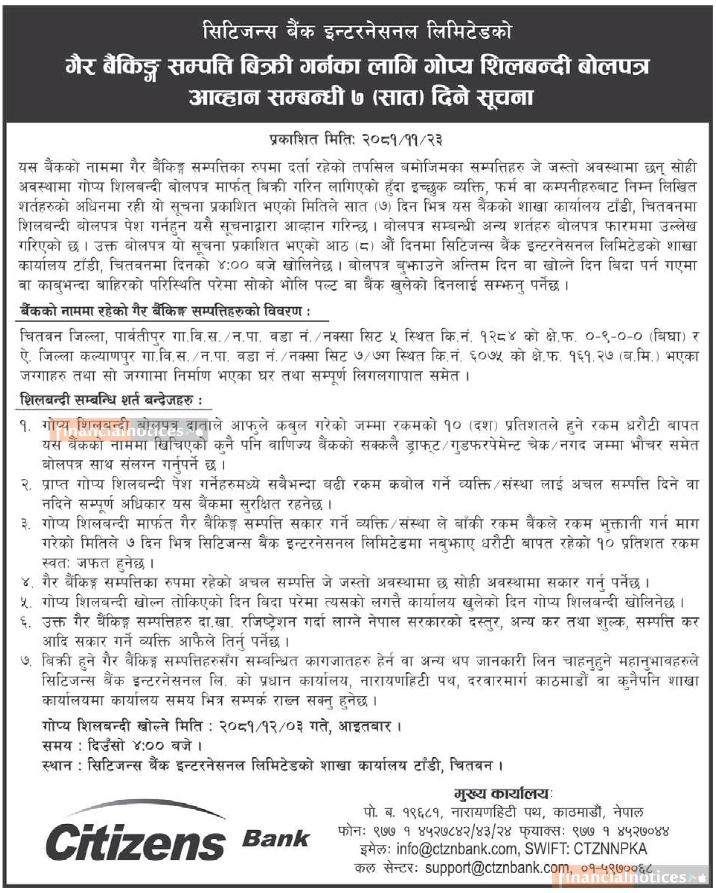 गैह्र बैंकिङ्ग सम्पत्ति बिक्री गर्नका लागि गोप्य शिलबन्दी बोलपत्र आव्हान सम्बन्धी ७ दिने सूचना