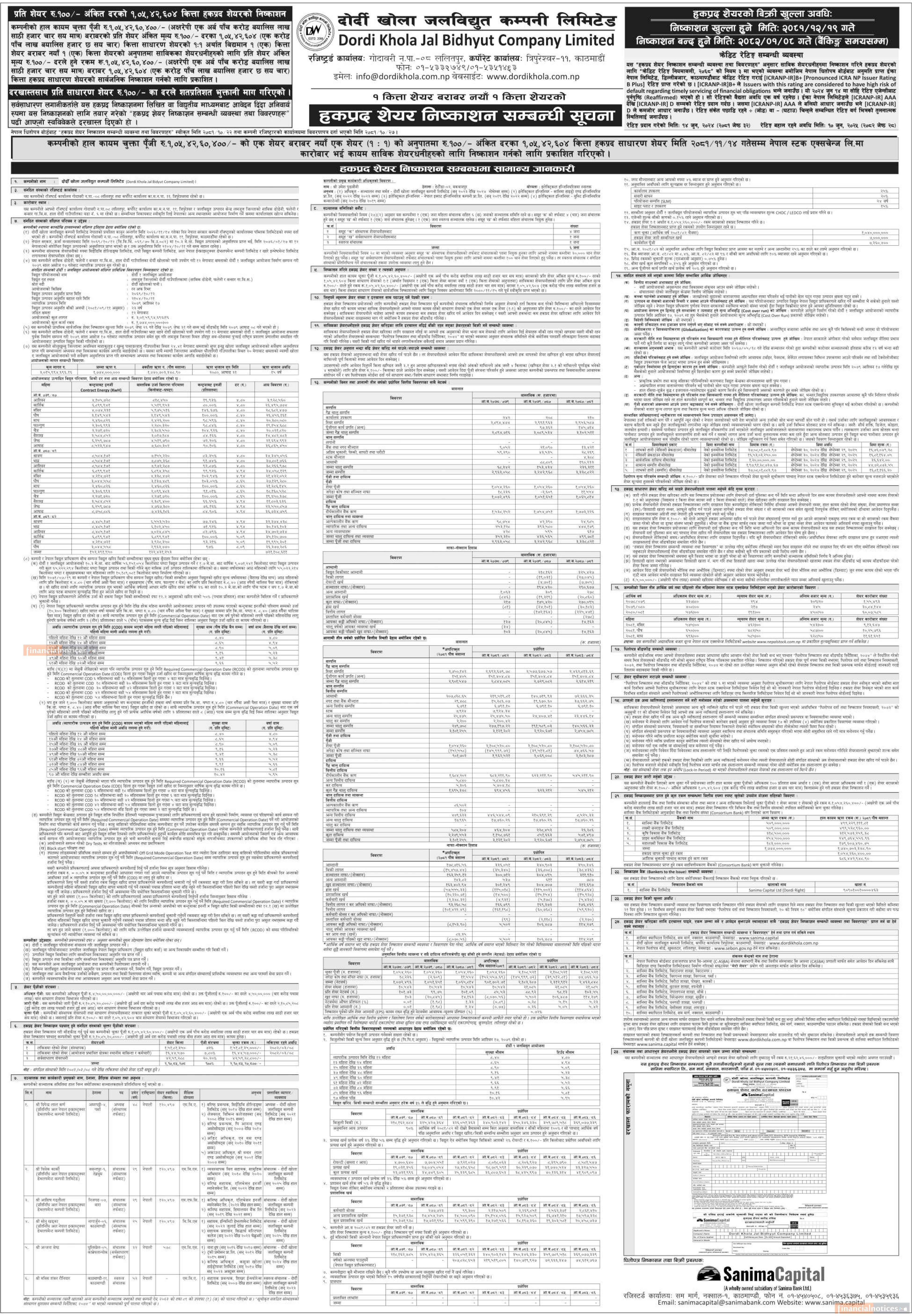 दोर्दी खोला जलविद्युत कम्पनीले चैत १९ गतेदेखि शतप्रतिशत हकप्रद शेयर निष्काशन गर्ने बारे सूचना
