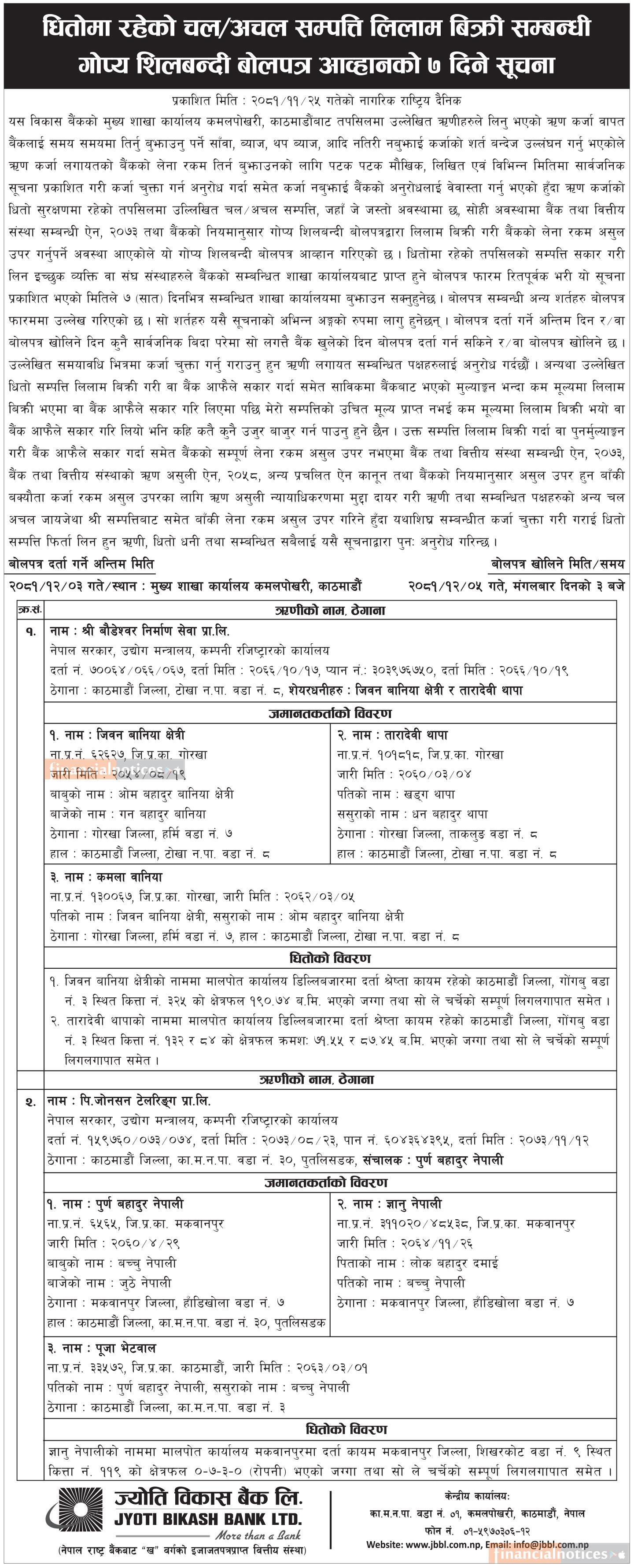 धितो रहेको चल अचल सम्पत्ति लिलाम बिक्री सम्बन्धी गोप्य शिलबन्दी बोलपत्र आव्हानको सूचना