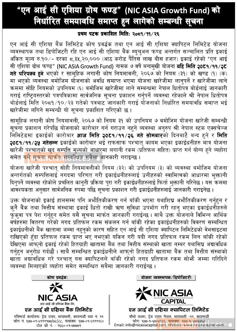 NIC Asia Growth Fund को निर्धारीत समयावधि समाप्त हुन लागेको सम्बन्धी सूचना