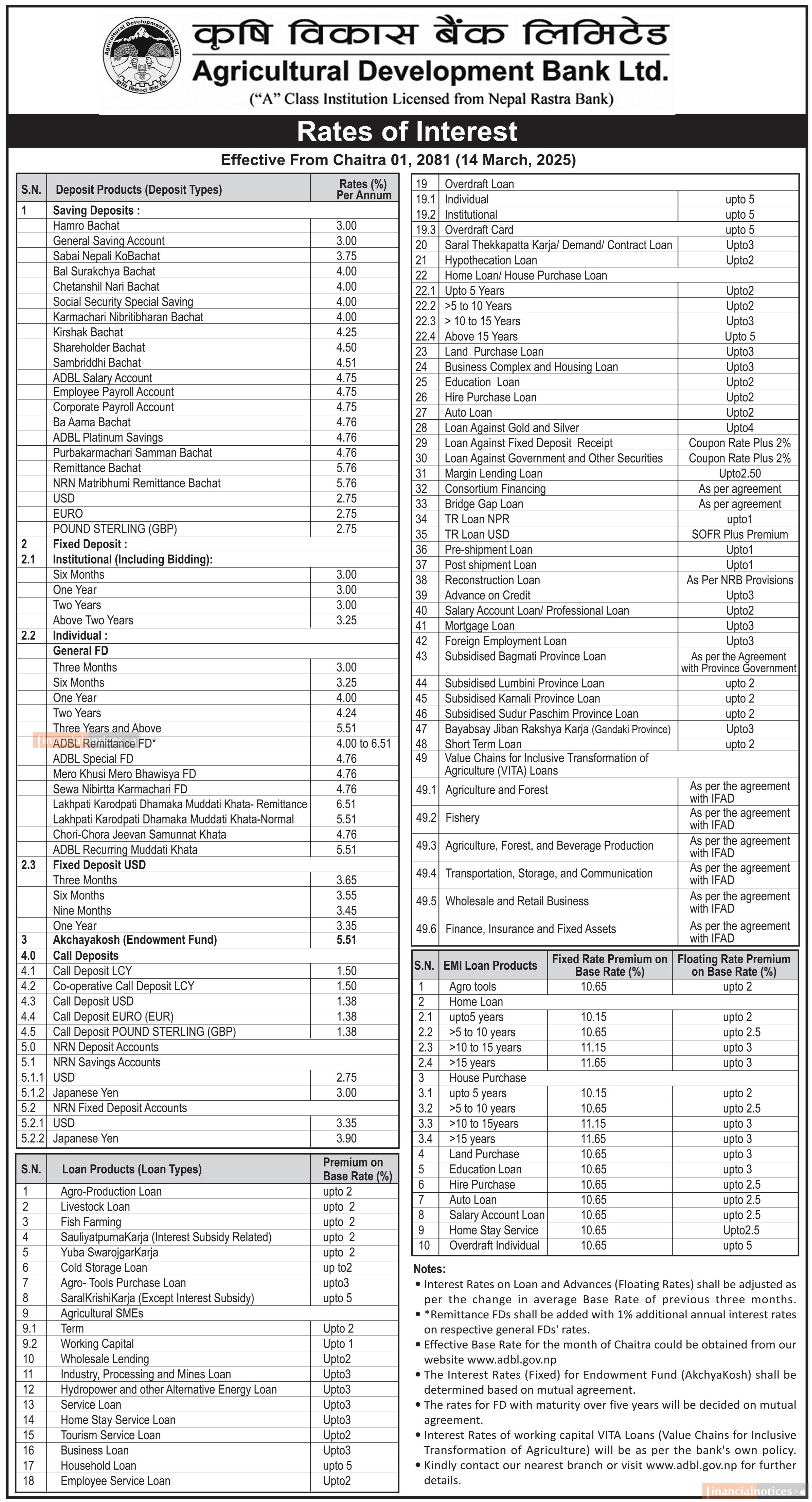 कृषि विकास बैंकको नयाँ ब्याजदर सार्वजनिक, कुन कुन खातामा कति ? - Interest Rates -