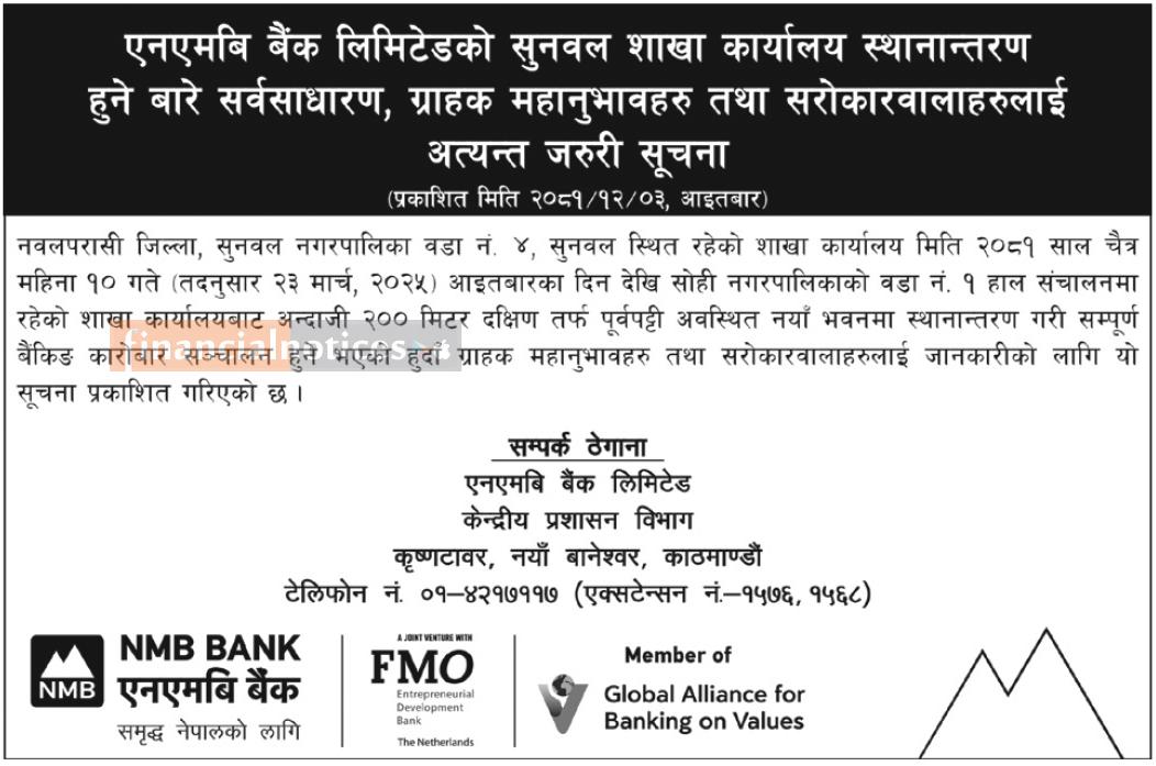 एनएनबि बैंकको शाखा स्थानान्तरण हुने सम्बन्धी सूचना