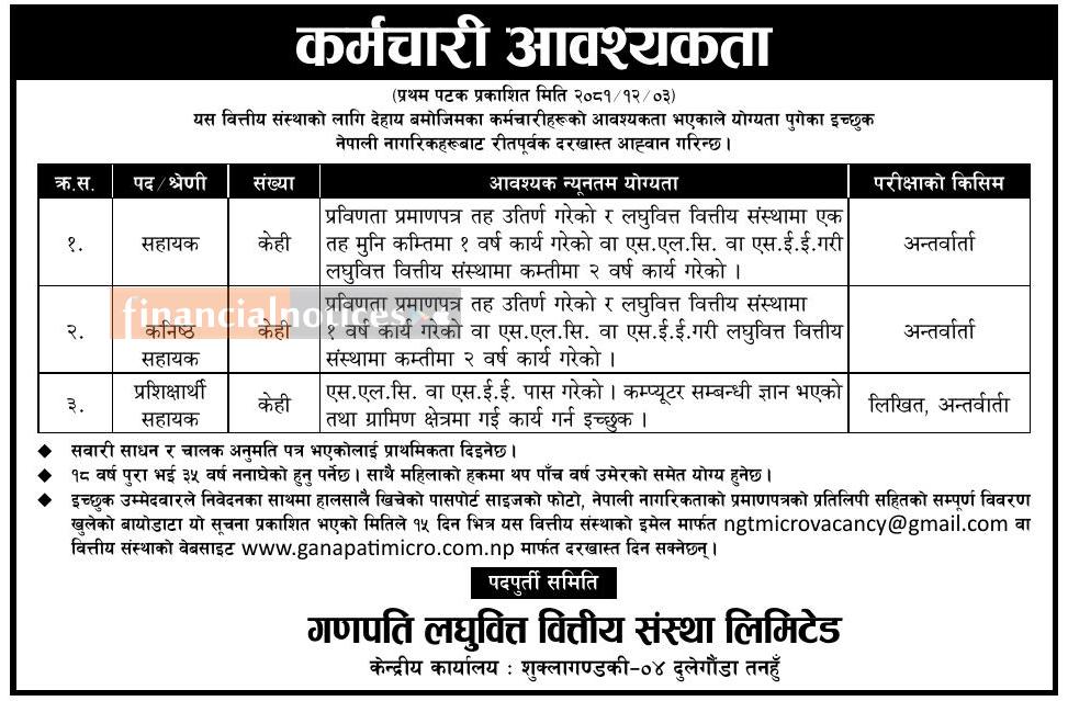 गणपति लघुवित्तमा कर्मचारी आवश्यकता - JOB Vacancy -