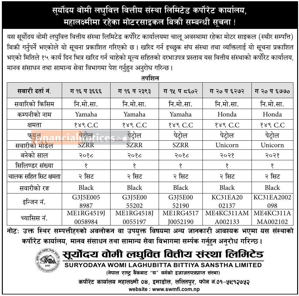 मोटसाइकल बिक्री सम्बन्धी सूचना