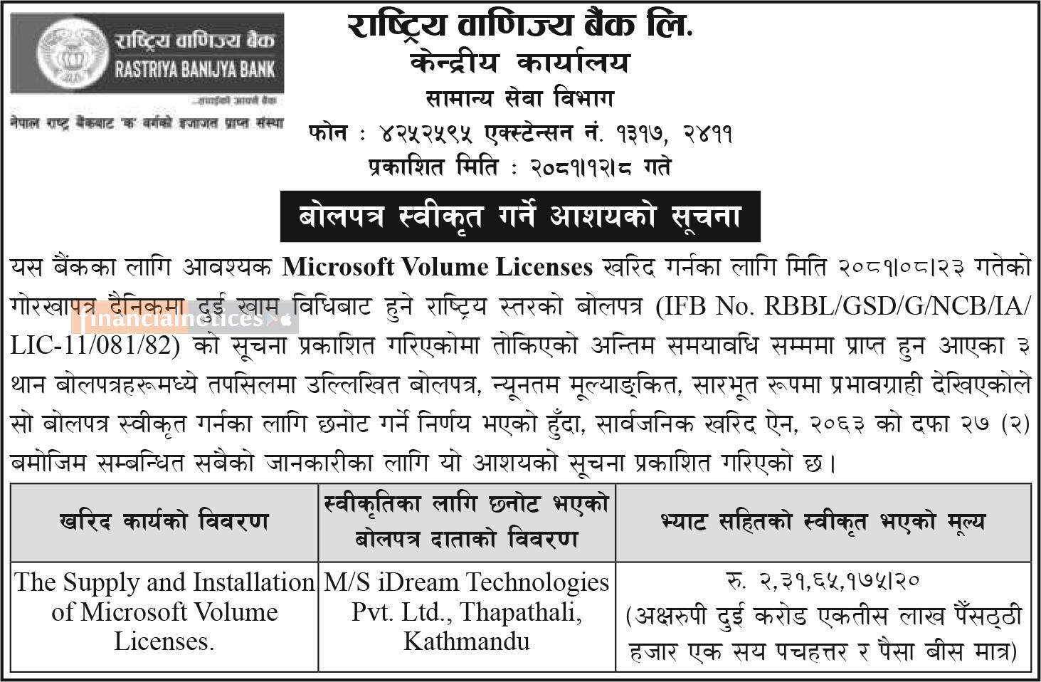बोलपत्र स्वीकृति गर्ने आशयको सूचना