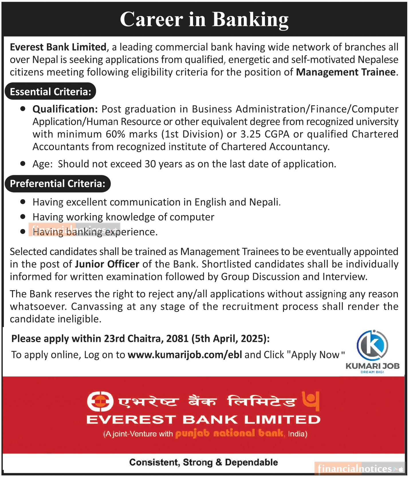 Everest Bank Limited, a leading commercial bank in Nepal, has announced vacancies for the position of Management Trainee, inviting applications from qualified, energetic, and self-motivated Nepalese citizens. Candidates must hold a postgraduate degree in Business Administration, Finance, Computer Application, Human Resource, or an equivalent field from a recognized university, with at least 60% marks (1st Division) or a 3.25 CGPA. Alternatively, qualified Chartered Accountants from recognized institutions are also eligible. The age limit for applicants is 30 years. Preferential criteria include proficiency in English and Nepali, computer literacy, and prior banking experience. Selected candidates will undergo Management Trainee training before being appointed as Junior Officers. The selection process includes a written examination, group discussion, and an interview. Interested applicants must apply online via www.kumarijob.com/ebl before 23rd Chaitra 2081 (5th April 2025). Everest Bank has stated that it reserves the right to reject any applications without explanation, and canvassing at any stage will result in disqualification.