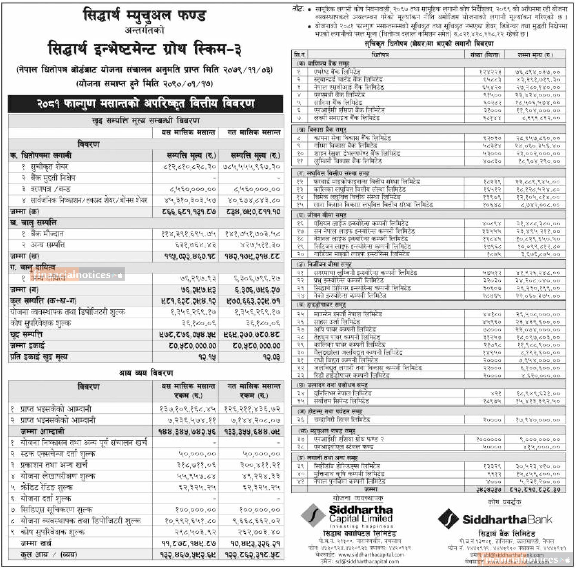 Siddhartha Capital has published “Siddhartha Investment Growth Scheme - 3” NAV till Falgun, 2081