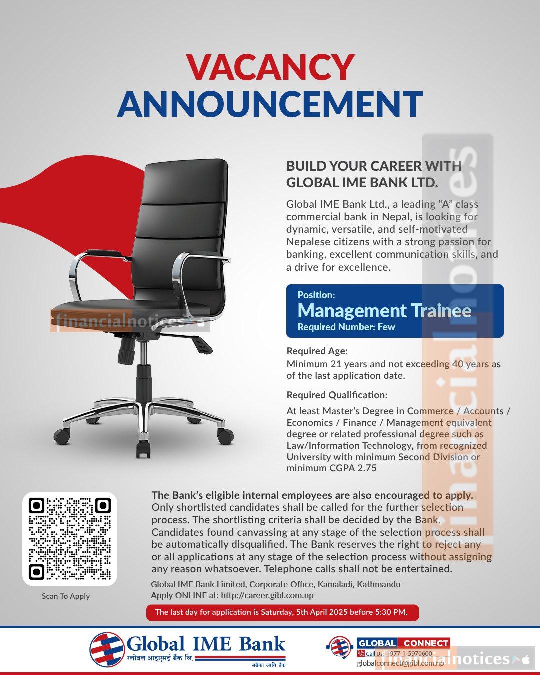 Kathmandu, March 30, 2025 – Global IME Bank Ltd., one of Nepal’s leading “A” class commercial banks, has announced a vacancy for the position of Management Trainee. The bank is seeking dynamic, versatile, and self-motivated Nepalese citizens with a passion for banking and strong communication skills.