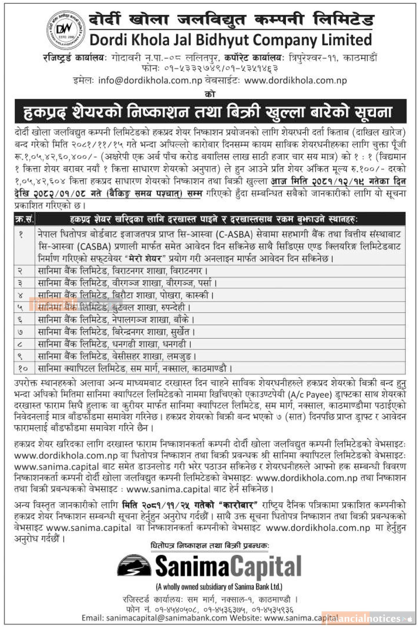 दोर्दी खोला जलविद्युतको हकप्रद शेयरमा आजदेखि खुला बारे सूचना