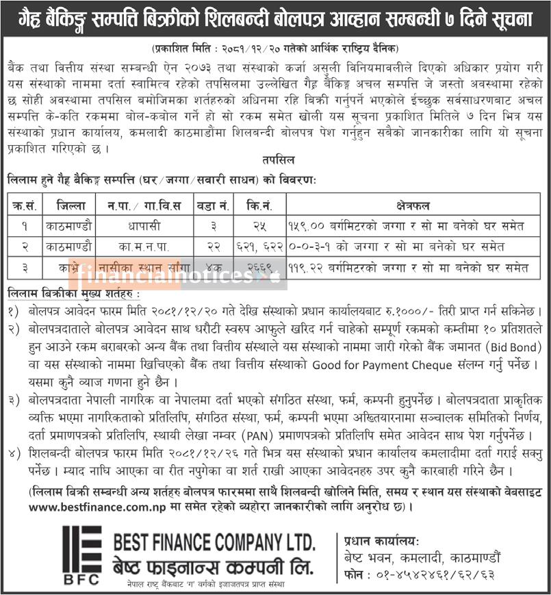 गैह्र बैंकिङ्ग सम्पत्ति बिक्रीको शिलबन्दी बोलपत्र आव्हान सम्बन्धी ७ दिने सूचना