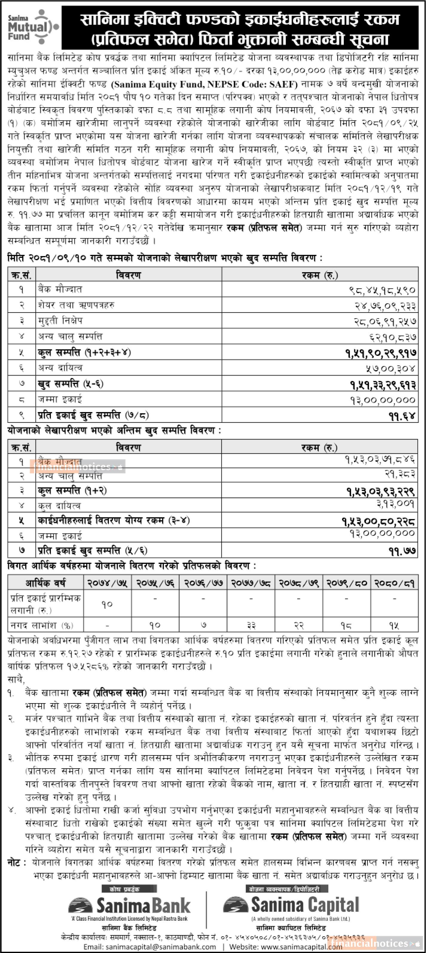 सानिमा इक्विटी फण्डको ईकाइधनीहरुलाई रकम फिर्ता भुक्तानी सम्बन्धी सूचना