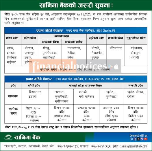 शाखा खुल्ला रहने सम्बन्धी सानीमा बैंकको जरुरी सूचना -