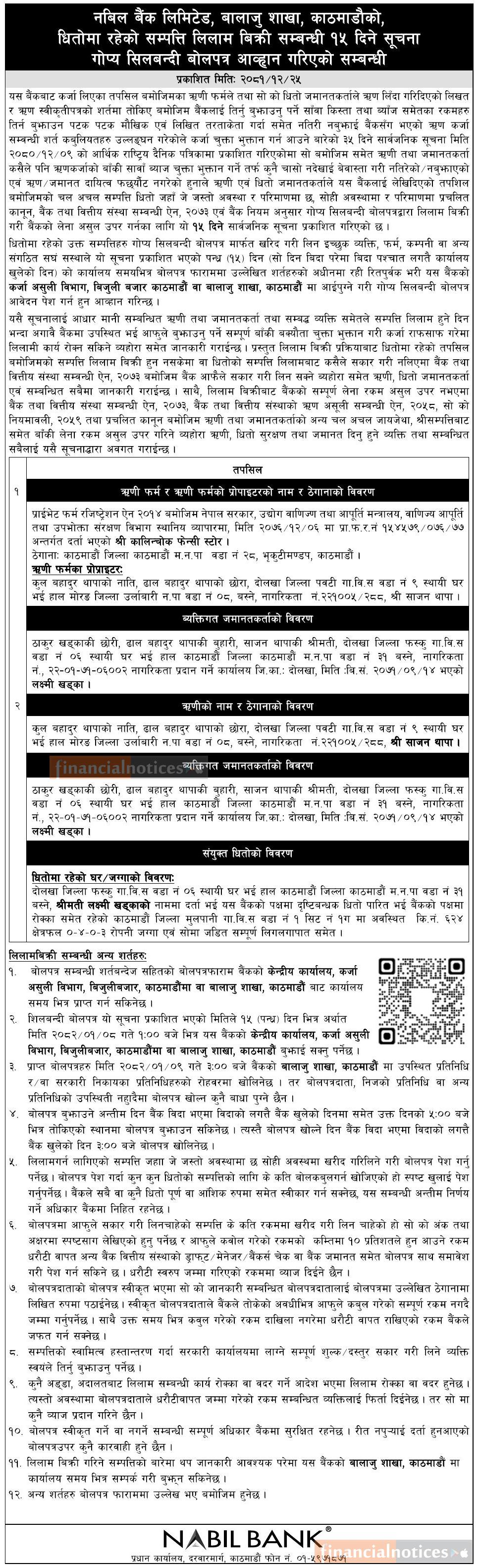 धितोमा रहेका सम्पत्ति लिलाम बिक्री सम्बन्धी १५ दिने गोप्य शिलबन्दी बोलपत्र आव्हानको सूचना