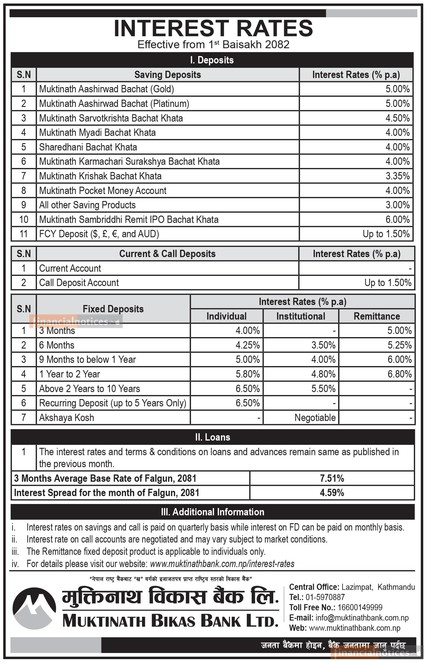 मुक्तिनाथ विकास बैंकको वैशाख २०८२ देखि नयाँ ब्याजदर लागु हुने सम्बन्धी सूचना -