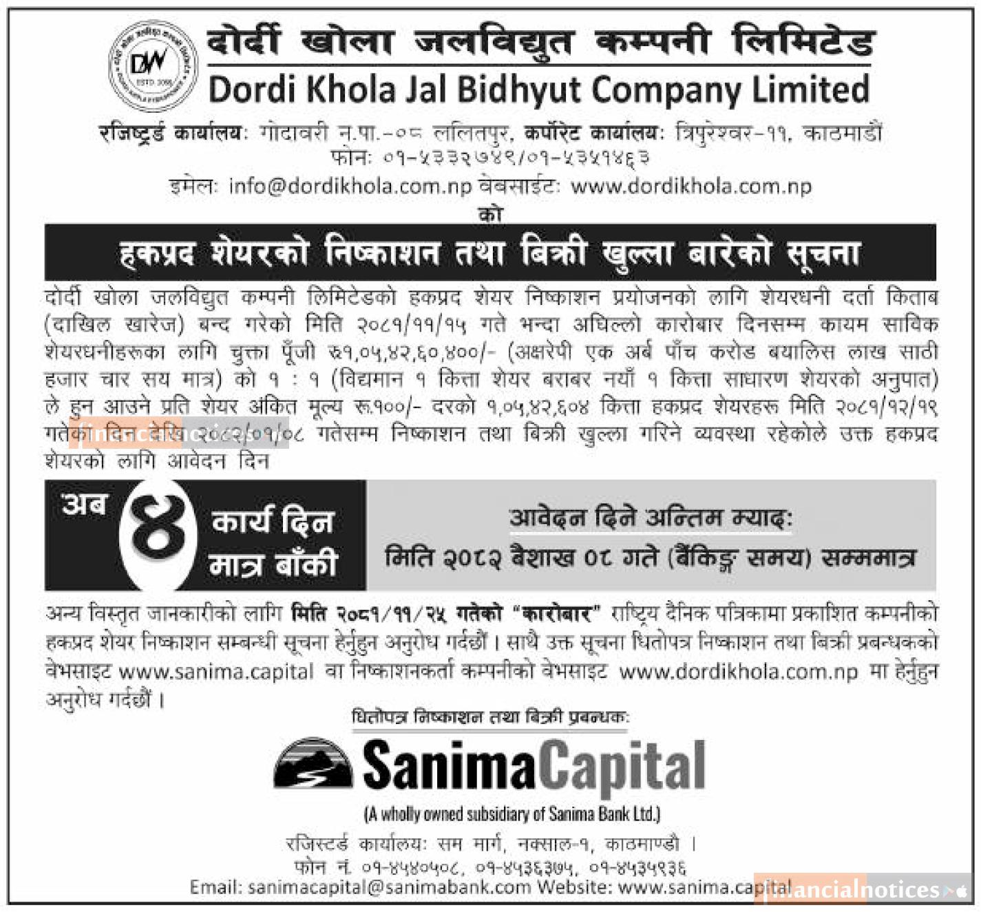 दोर्दि खोला जलविद्युत कम्पनीमा आवेदन दिन मात्र ४ दिन मात्र बाँकी सम्बन्धी सूचना