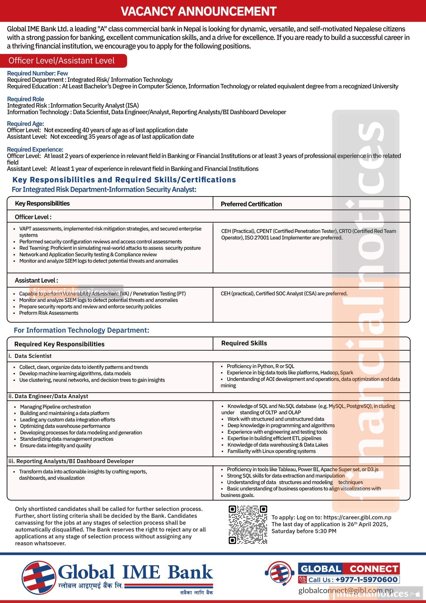 Kathmandu, April 20 – Global IME Bank Ltd., a leading 'A' class commercial bank in Nepal, has opened job opportunities for dynamic and self-motivated Nepalese citizens seeking to build a career in banking. The bank has announced vacancies for Officer and Assistant Level positions in its Integrated Risk and Information Technology departments.