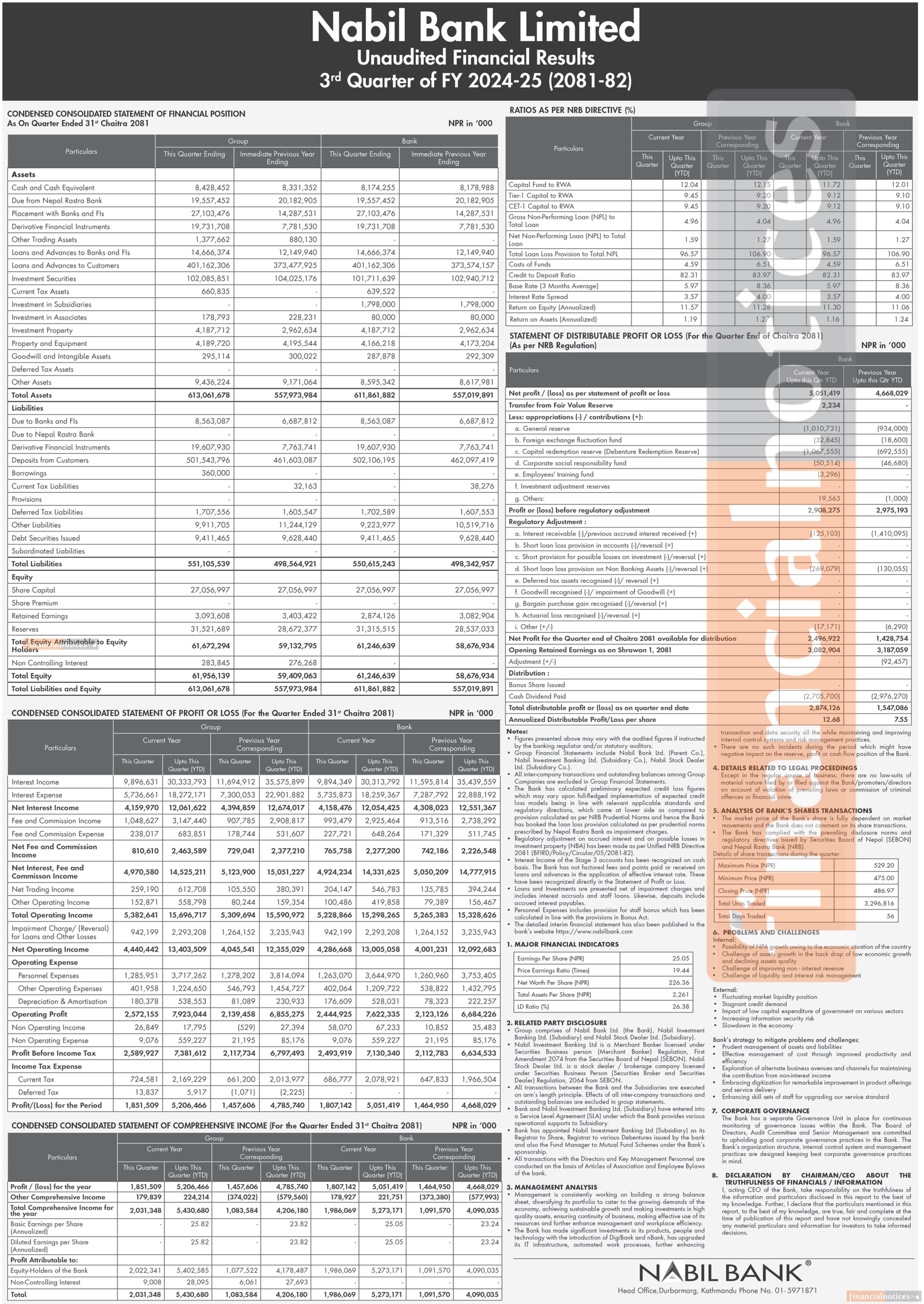 नबिलको वितरणयोग्य नाफा ८५.७८ प्रतिशतले बढेर २ अर्ब ८७ करोड रुपैयाँ पुगेको छ। यो नाफा भविष्यमा लगानीकर्तालाई लाभांश वितरण गर्न उपयोगी हुन सक्छ।