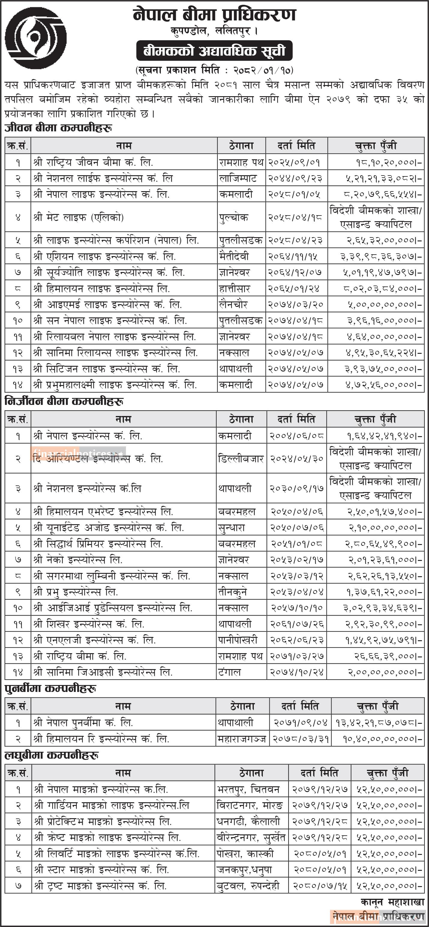 बीमकको अद्यावधिक सूची सम्बन्धी सूचना