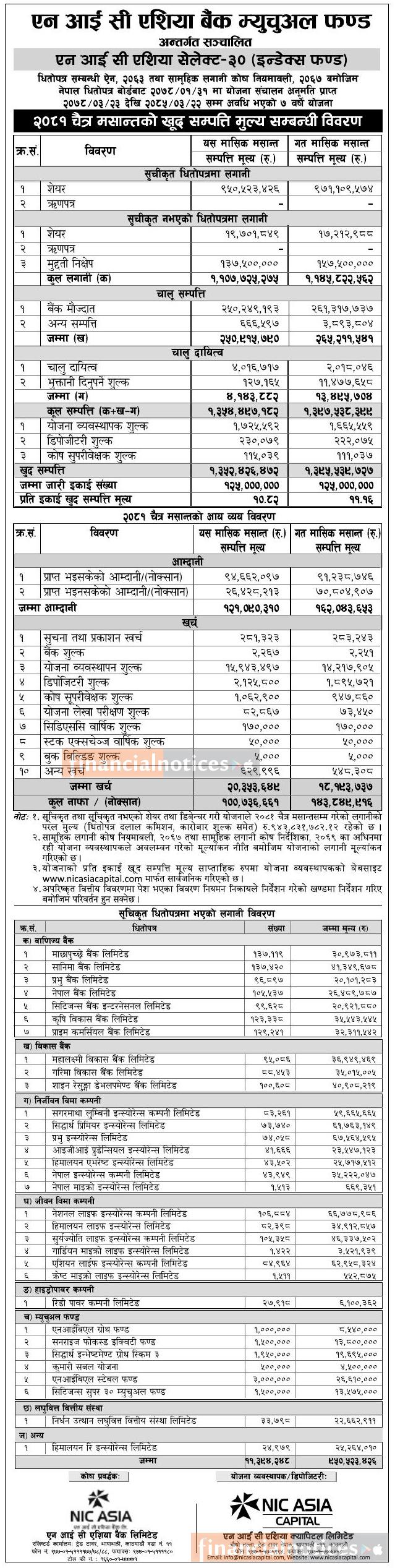 NIC Asia Capital has published "NIC Asia Select-30 (Index Fund)" NAV till Chaitra, 2081