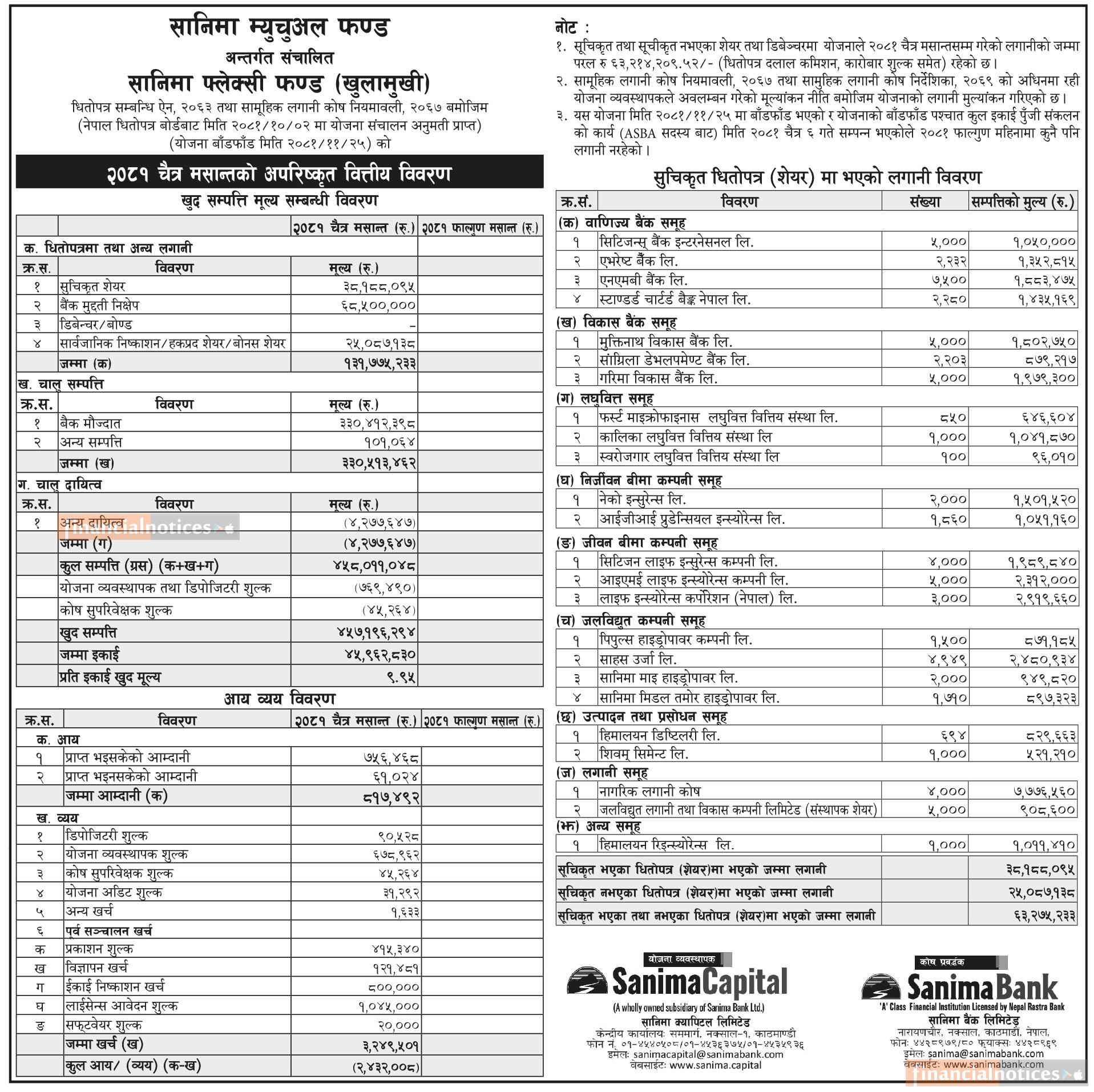 Sanima Capital has published “Sanima Flexi Fund” Net Asset Value till Chaitra, 2081