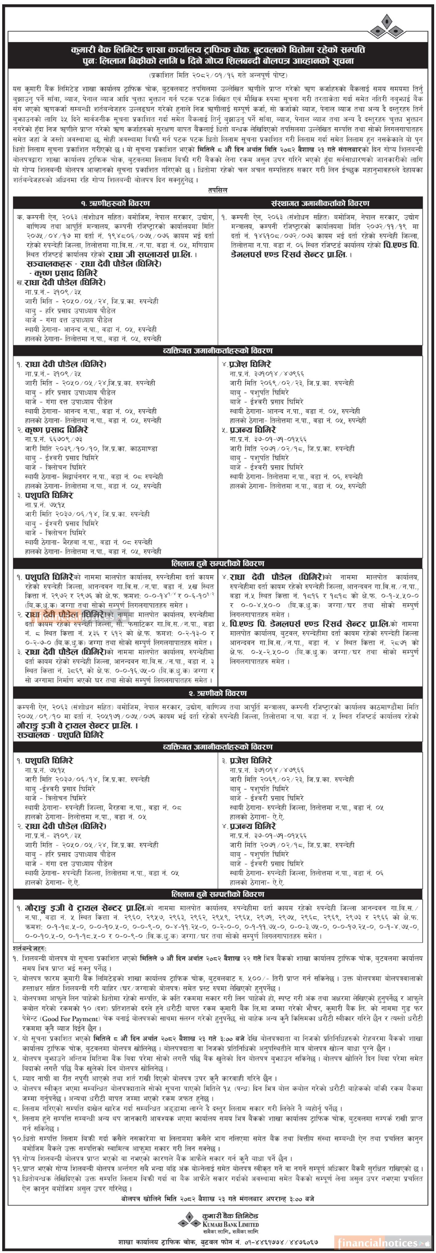 बुटवलको धितोमा रहेको सम्पत्ति पुनः लिलाम बिक्रीको लागि ७ दिने गोप्य शिलबन्दी बोलपत्र आव्हानको सूचना