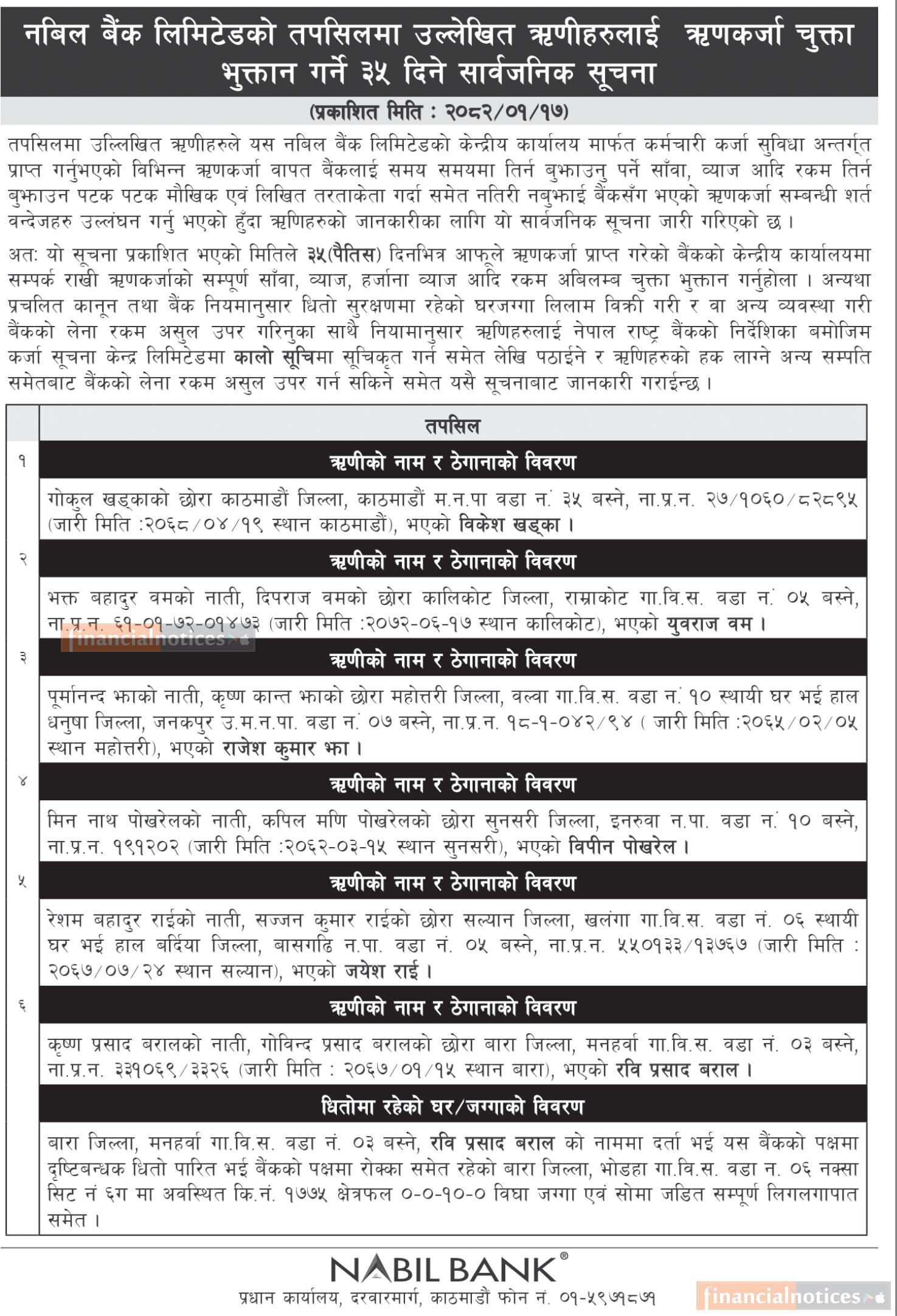 नबिल बैंकको ऋणीहरुलाई ऋणकर्जा चुक्ता भुक्तान गर्ने ३५ दिने सार्वजनिक सूचना