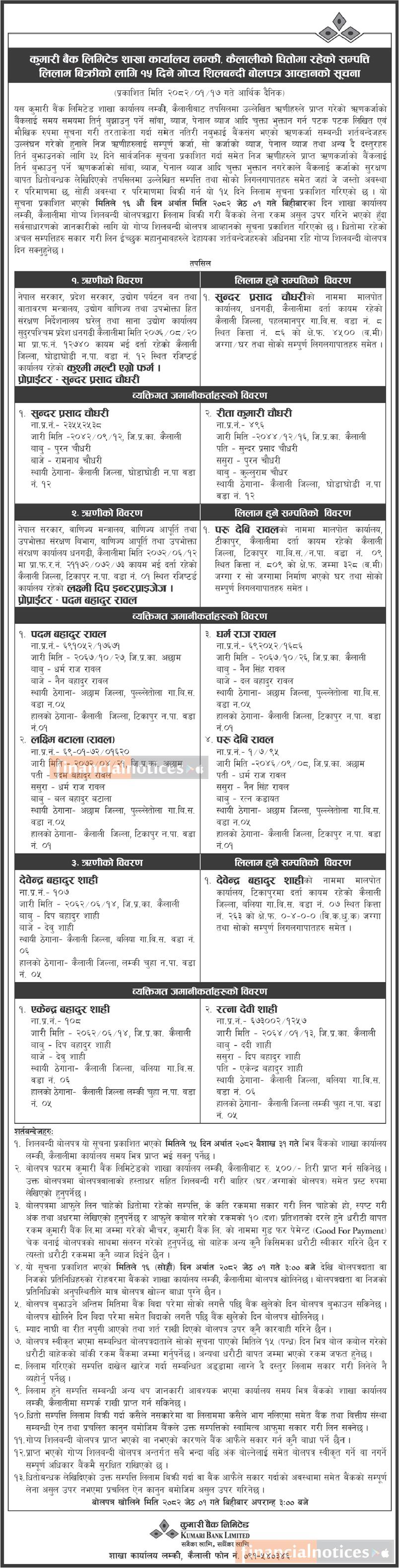 कुमारी बैंकको धितोमा रहेको सम्पत्ति लिलाम बिक्रीको सूचना -