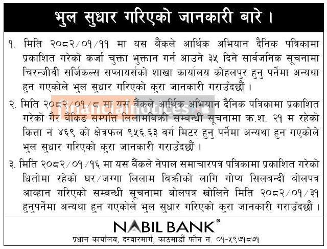 भुल सुधार गरिएको सम्बन्धी नबिल बैंकको सूचना