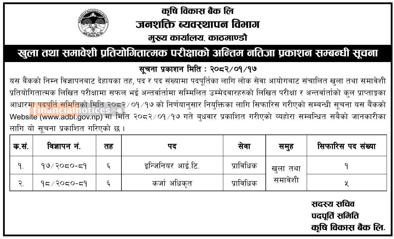 कृषि विकास बैंकको खुला तथा समावेशी परीक्षाको नतिजा प्रकाशन सम्बन्धी सूचना