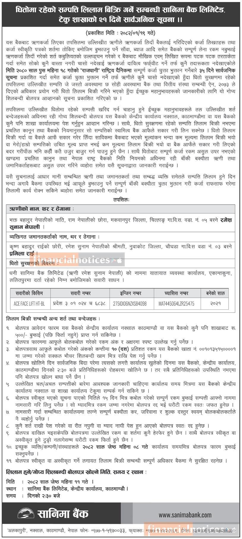 धितोमा सम्पत्ति लिलाम बिक्री सम्बन्धी सानिमा बैंकको सम्बन्धी सूचना