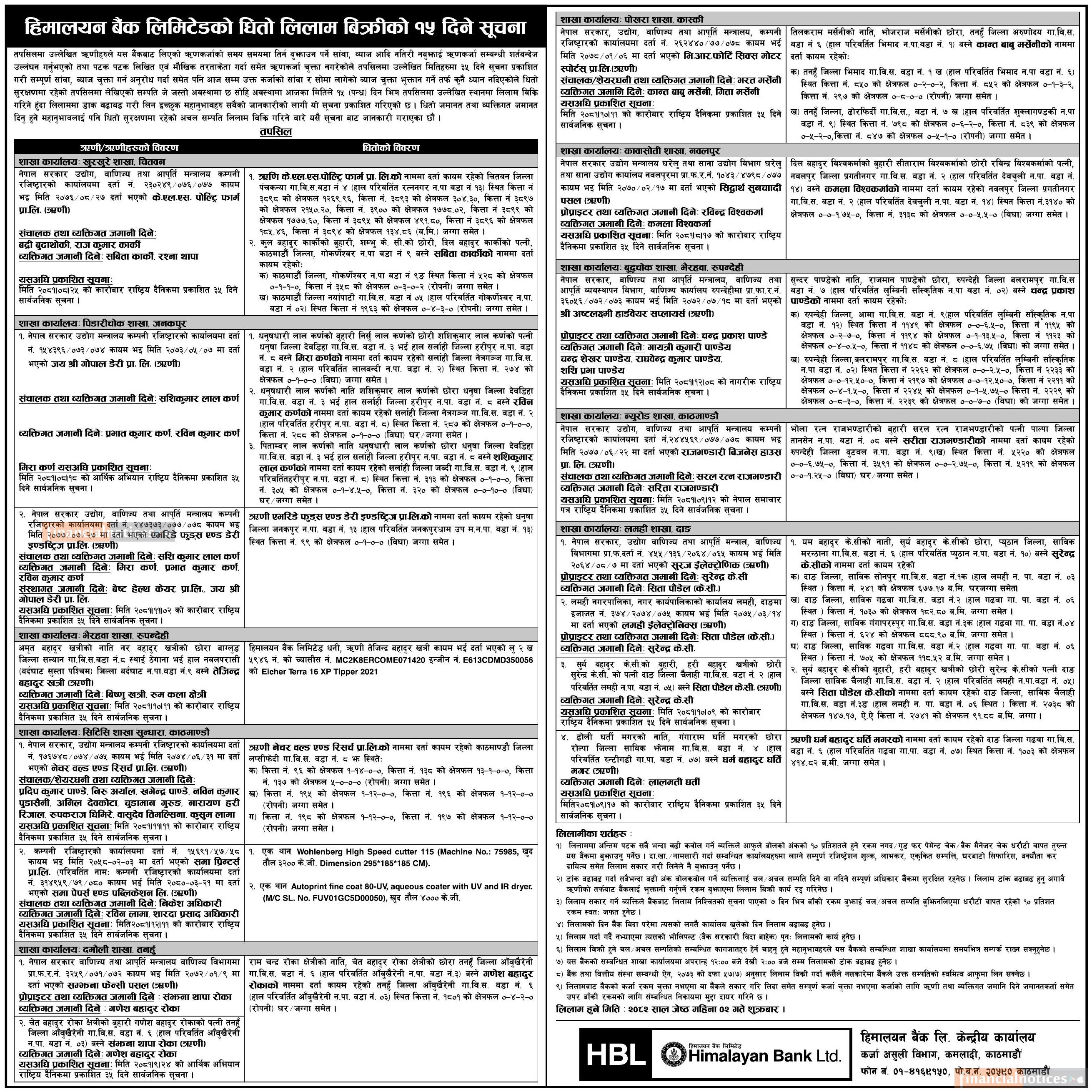 हिमालयन बैंकद्वारा धितो लिलाम बिक्रीको १५ दिने सूचना -