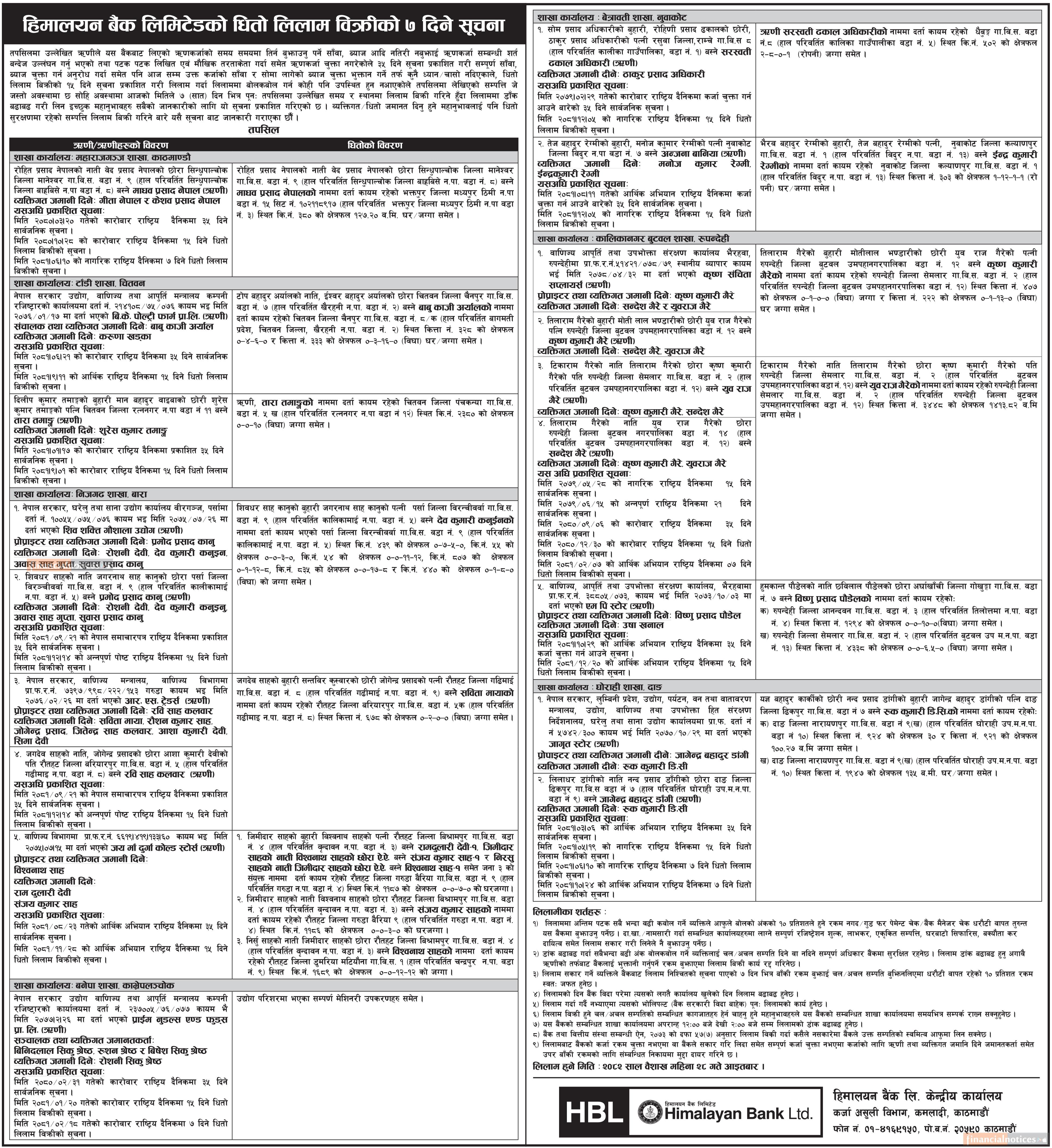 हिमालयन बैंकद्वारा धितो लिलाम बिक्रीको ७ दिने सूचना -