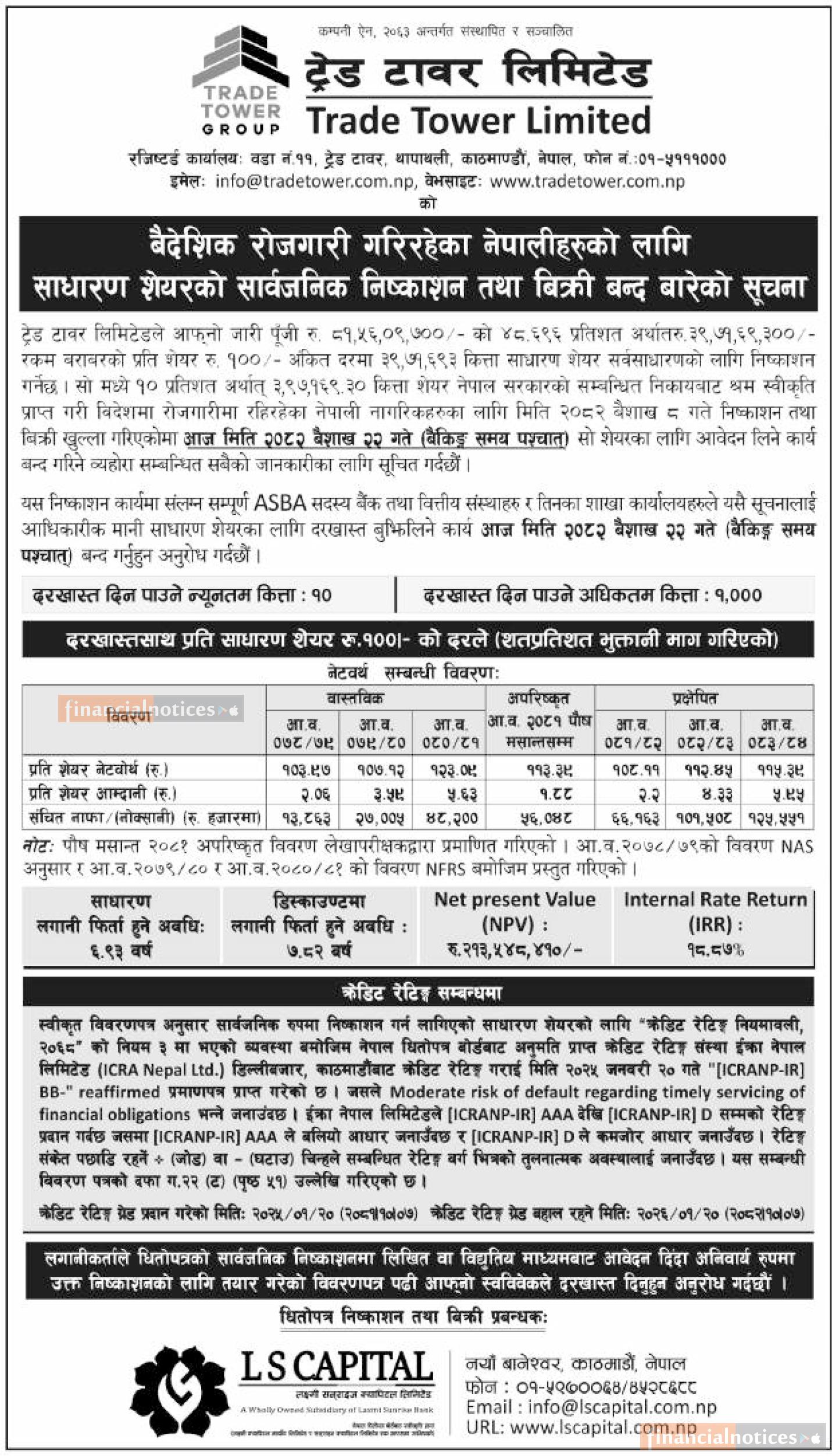 ट्रेड टावरको आईपीओमा आवेदन दिने आज अन्तिम दिन सम्बन्धी सूचना