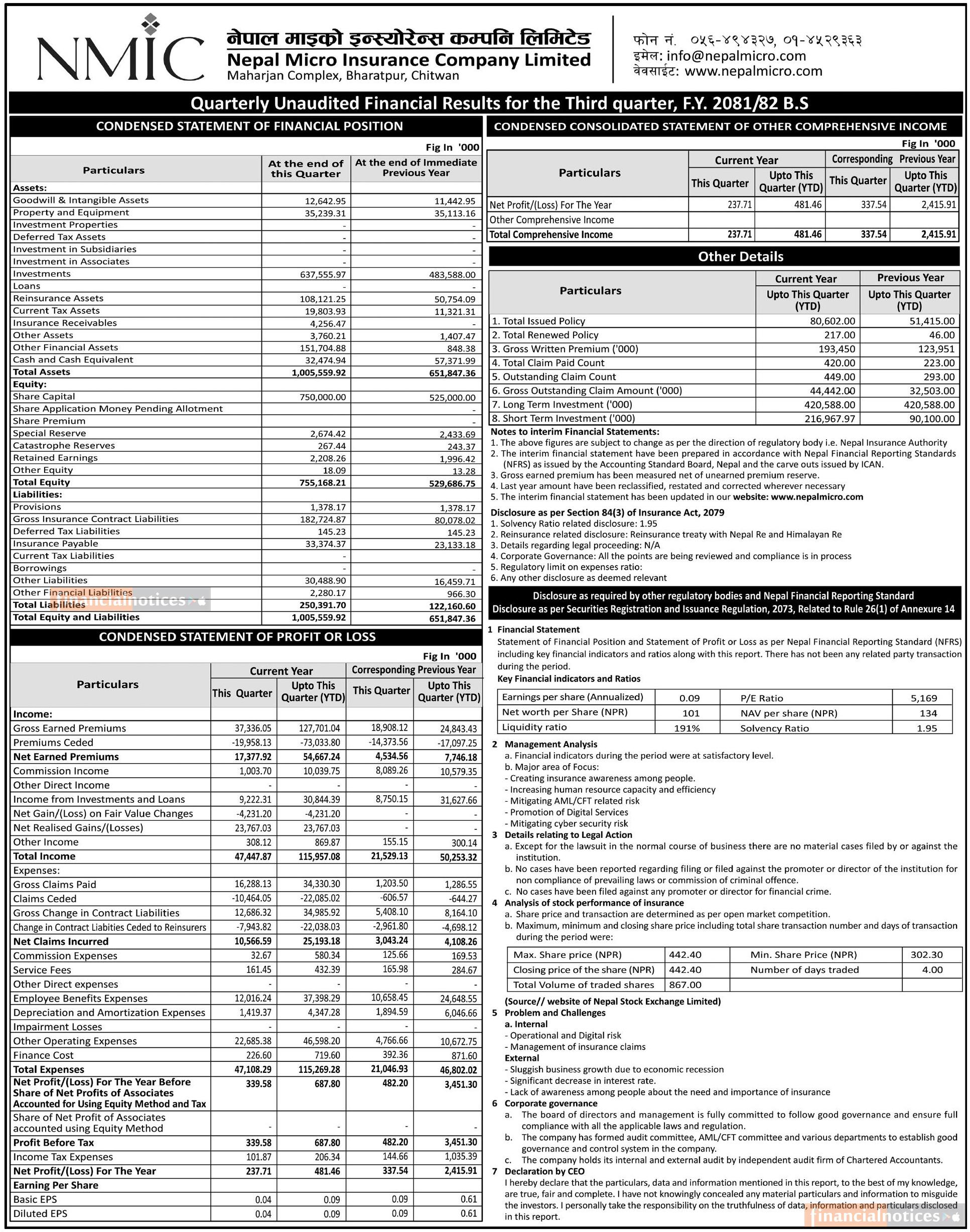 NMIC has posted a net profit of Rs 0.48 million and published its 3rd quarter company