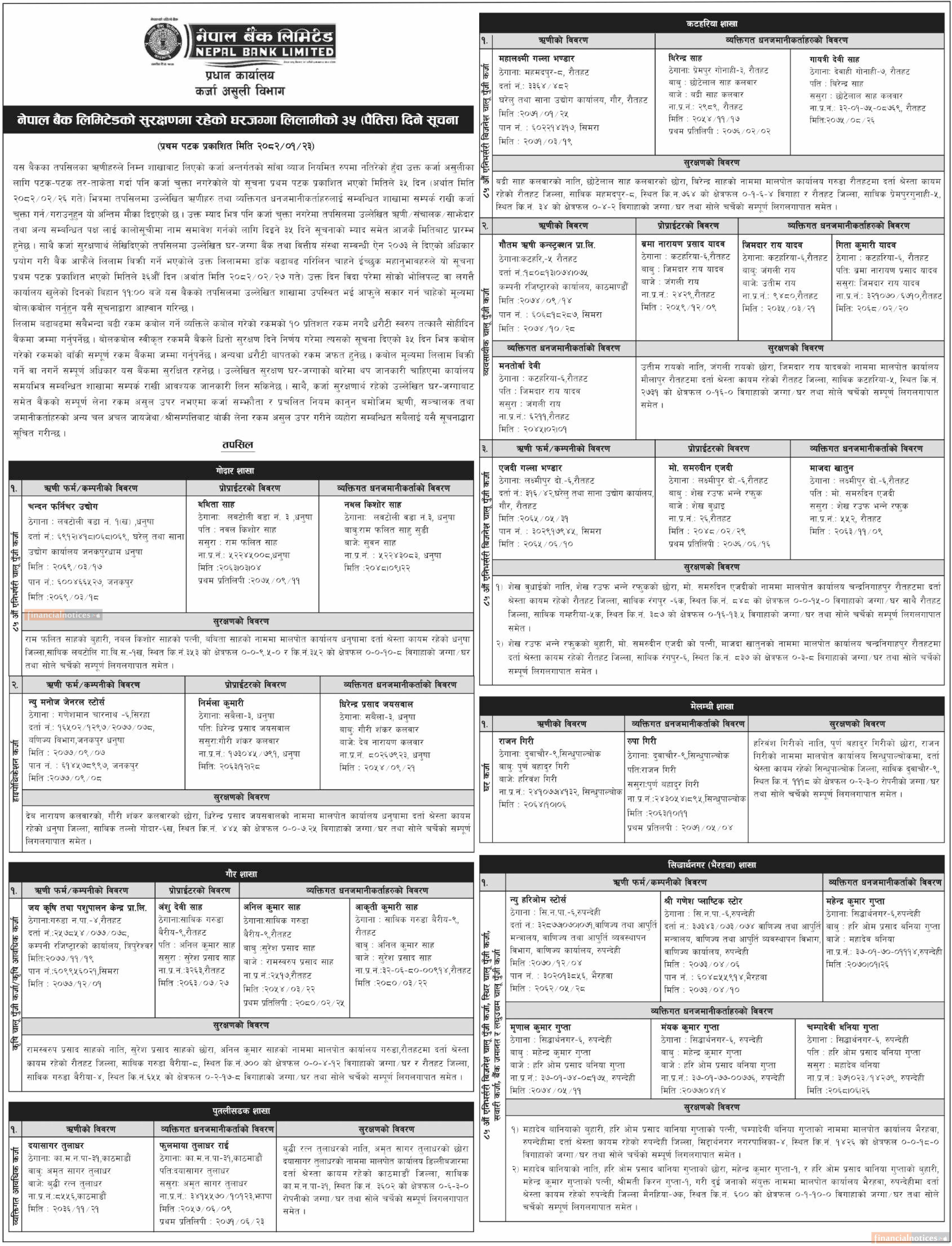 नेपाल बैंकको सुरक्षणमा रहेको घरजग्गा लिलामीको ३५ दिने सूचना
