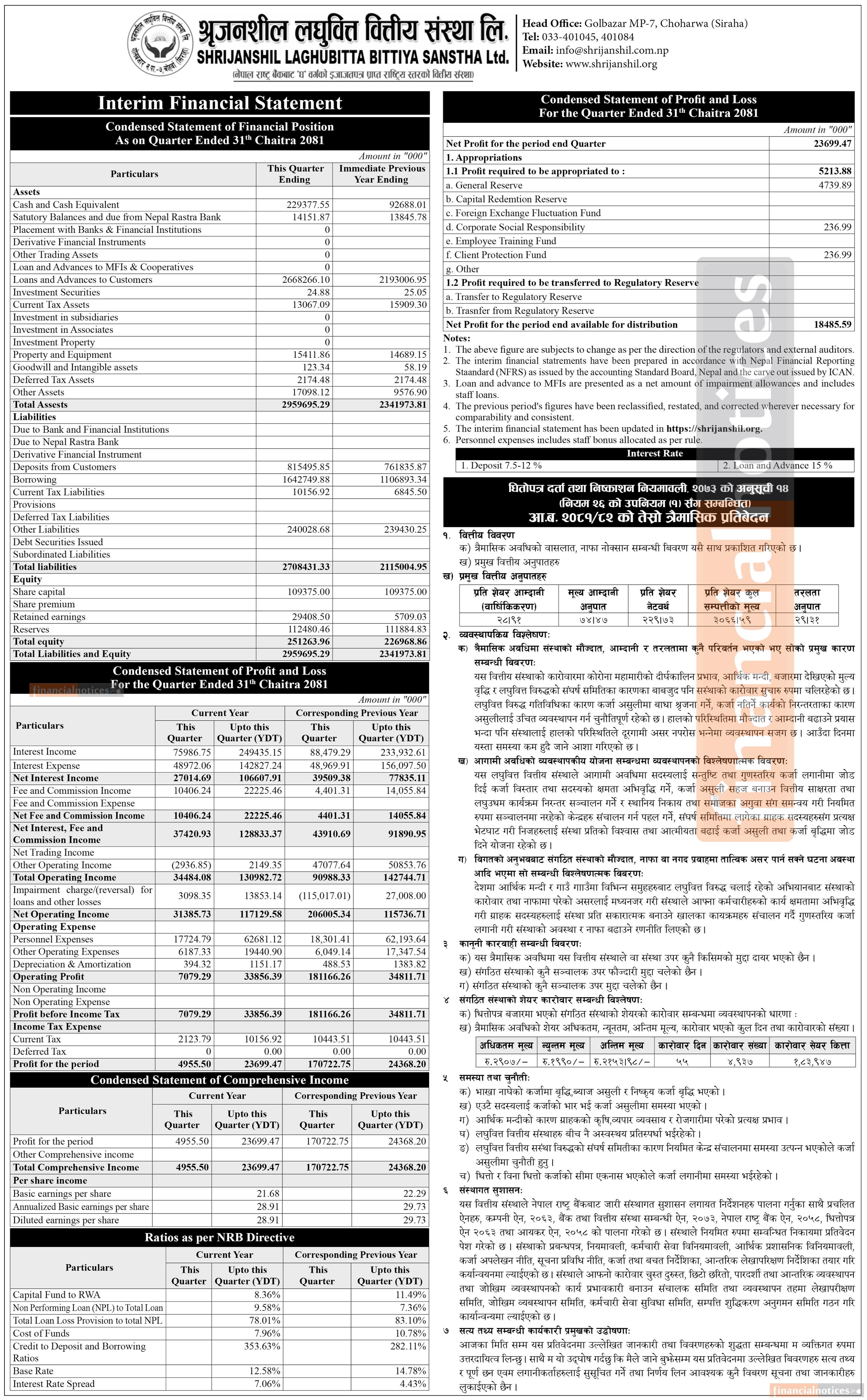 श्रृजनशील लघुवित्तको तेस्रो त्रैमासमा खुद नाफा २करोड ३६ लाख ९९ हजार रुपैयाँ